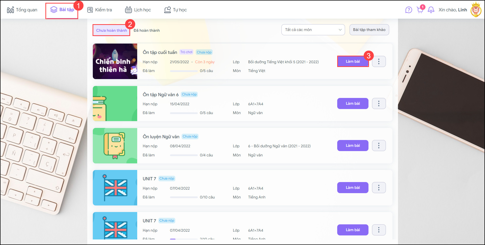 Bước 1: Học sinh vào Bài tập\Chưa hoàn thành, sau đó chọn game chiến binh thiên hà và nhấn Làm bài.