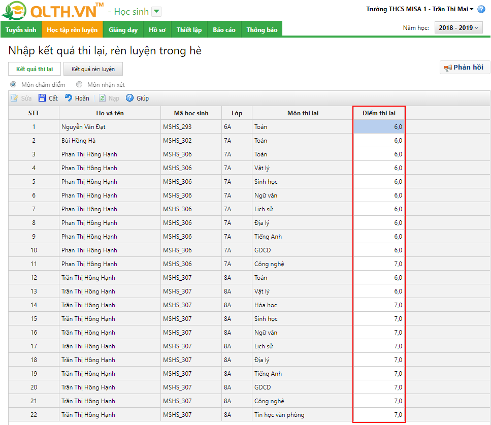 2.1 Nhập kết quả thi lại cho học sinh
