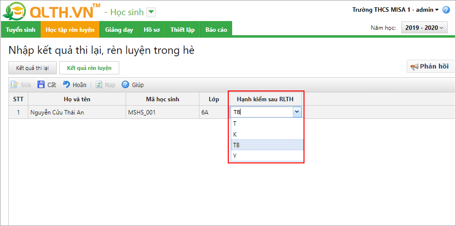 3. Sau đó nhập kết quả rèn luyện cho học sinh tại cột Hạnh kiểm sau RLTH.