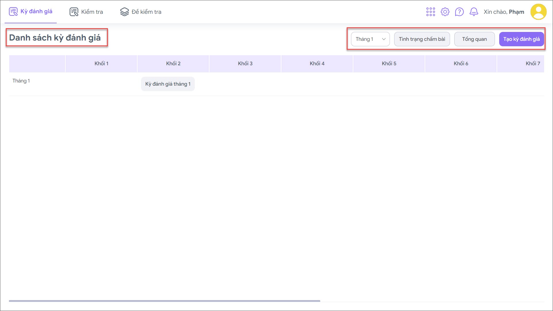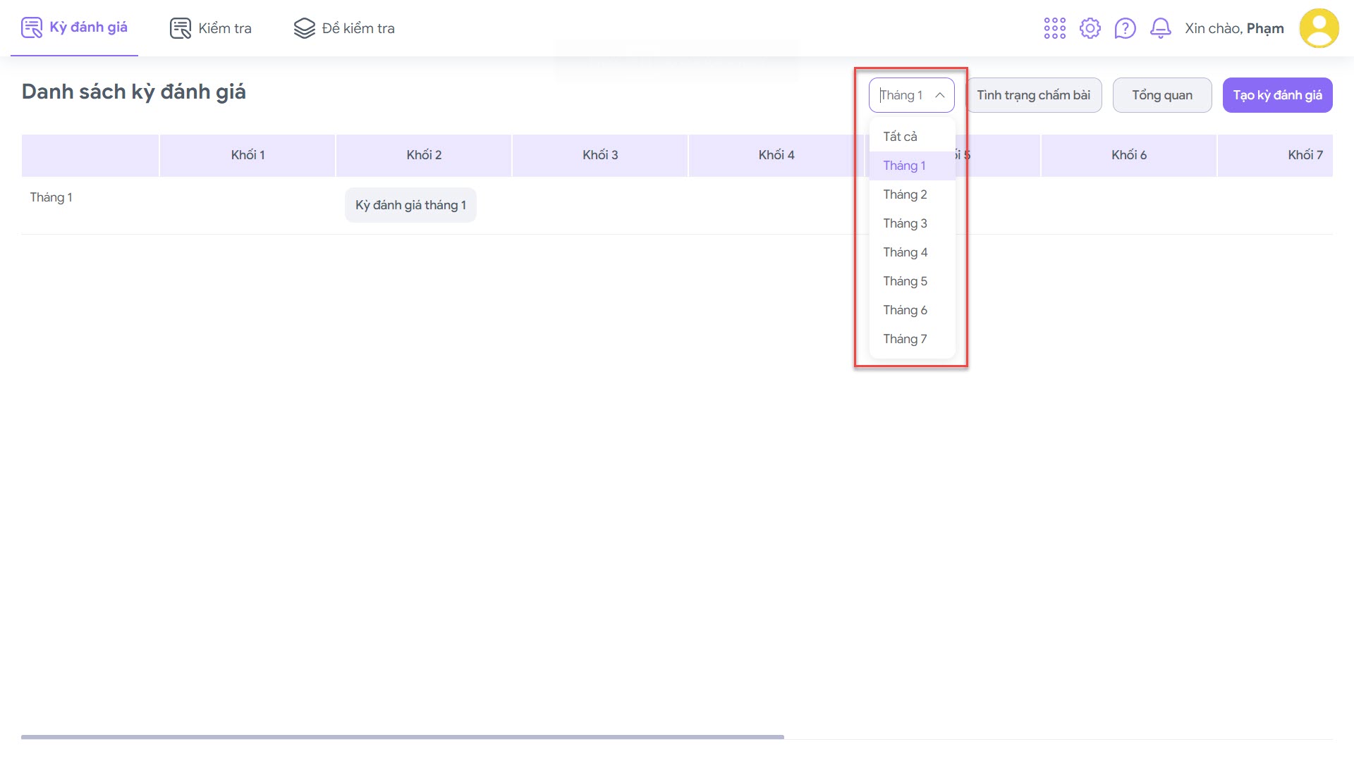- Thầy cô xem danh sách kỳ đánh giá theo từng tháng để tìm kiếm thông tin nhanh chóng.