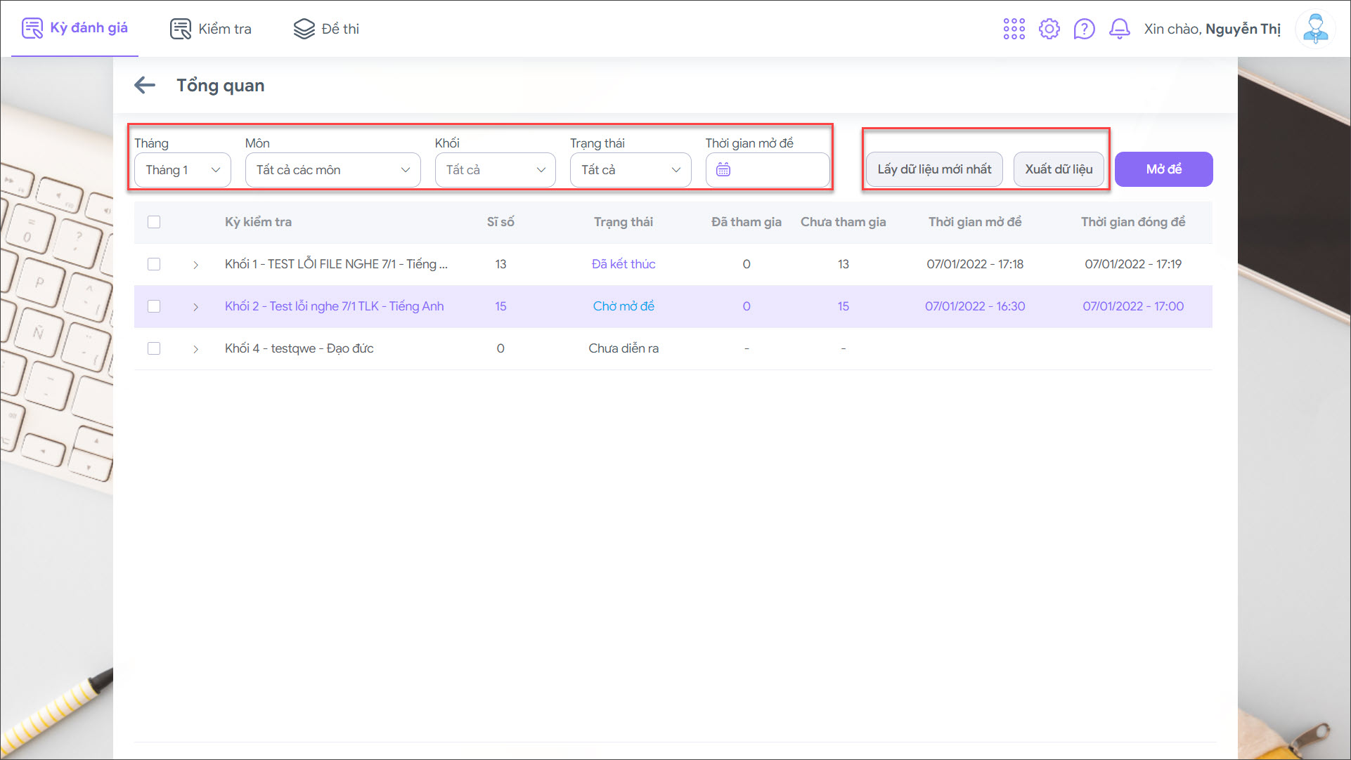 - Thầy cô có thể xem được Tổng quan, chọn theo: Tháng, môn, khối, trạng thái, thời gian mở đề hoặc lấy dữ liệu mới và xuất dữ liệu.