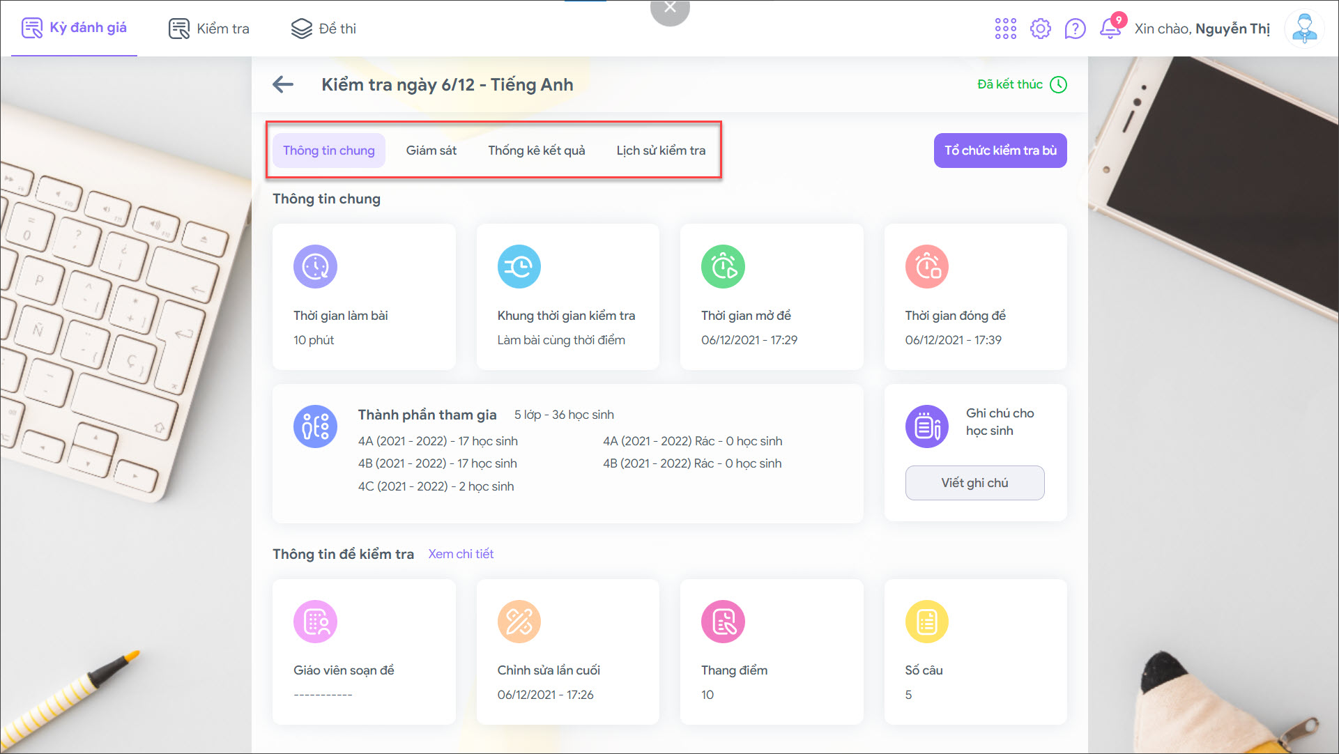 - Tại đây, thầy cô xem được: Thông tin chung, Giám sát, Thống kê kết quả, Lịch sử kiểm tra.