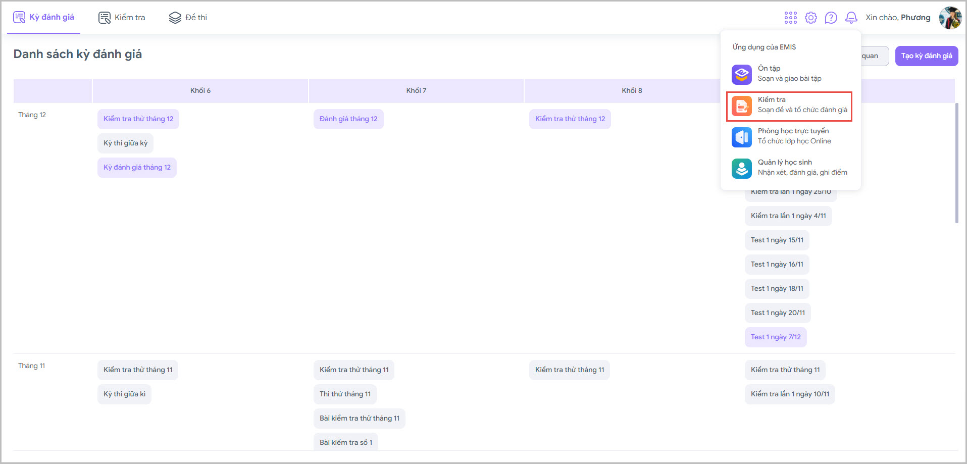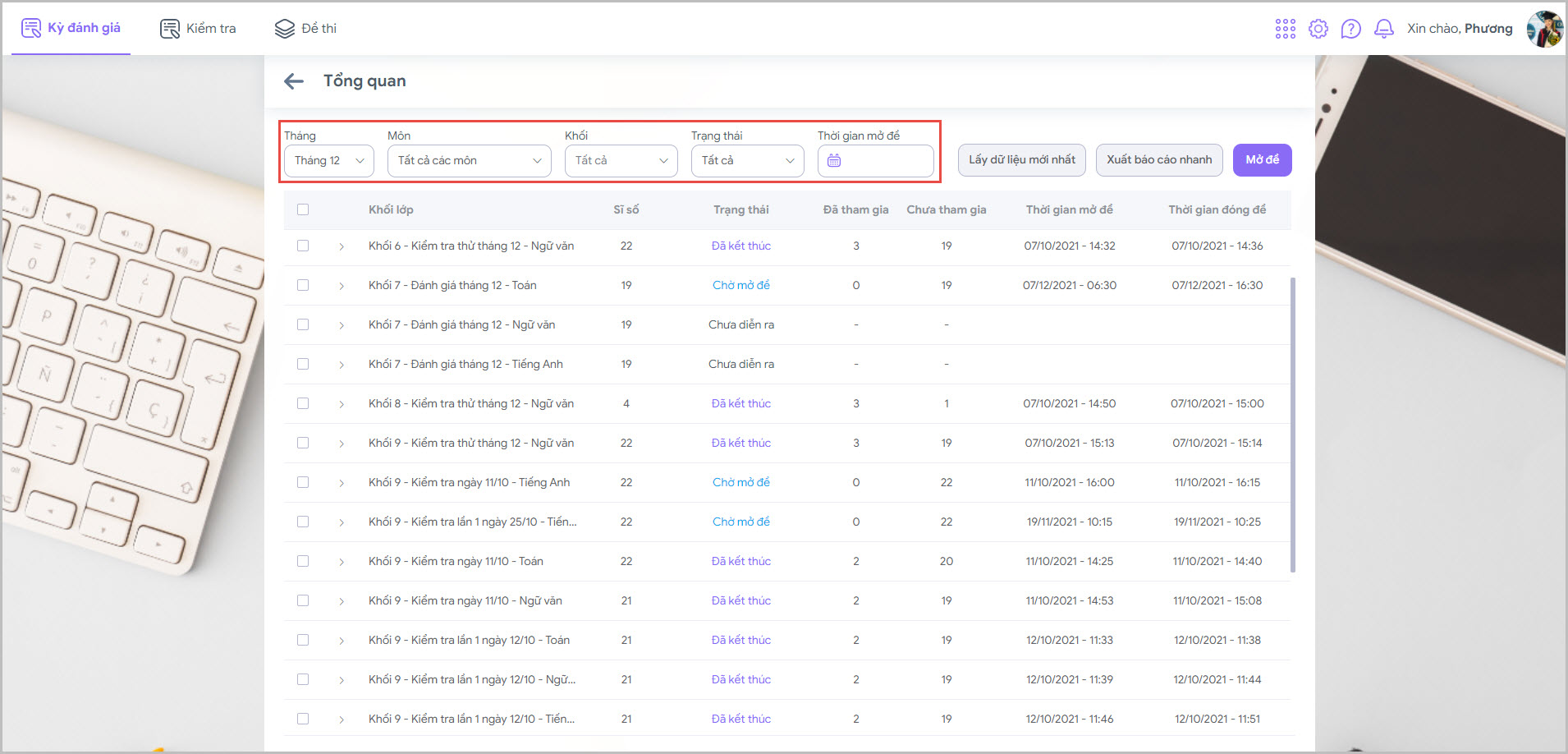 • Tại đây, ban giám hiểu xem được tổng quan các kỳ đánh giá, chọn lọc theo tháng, môn, khối, trạng thái và thời gian mở đề.