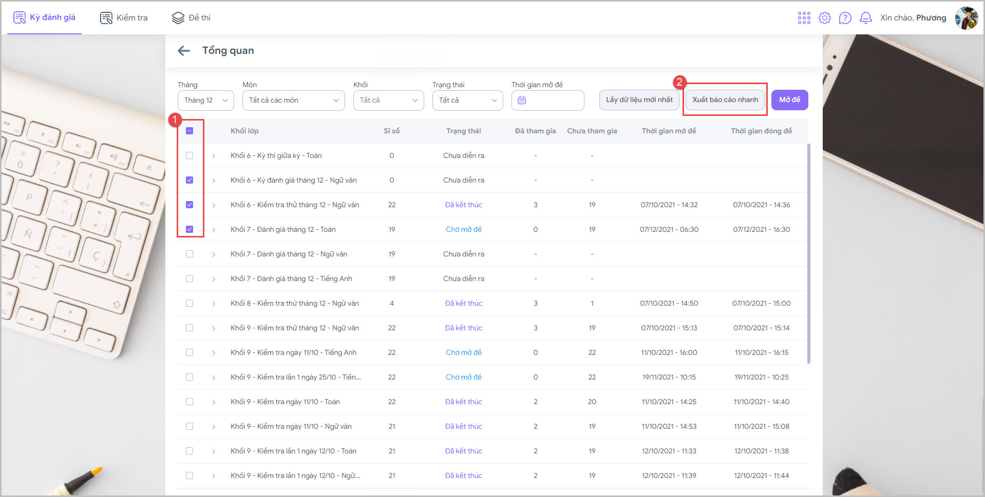 • Ban giám hiệu vào Kiểm tra\Tổng quan để xem các lớp muốn xuất khẩu.