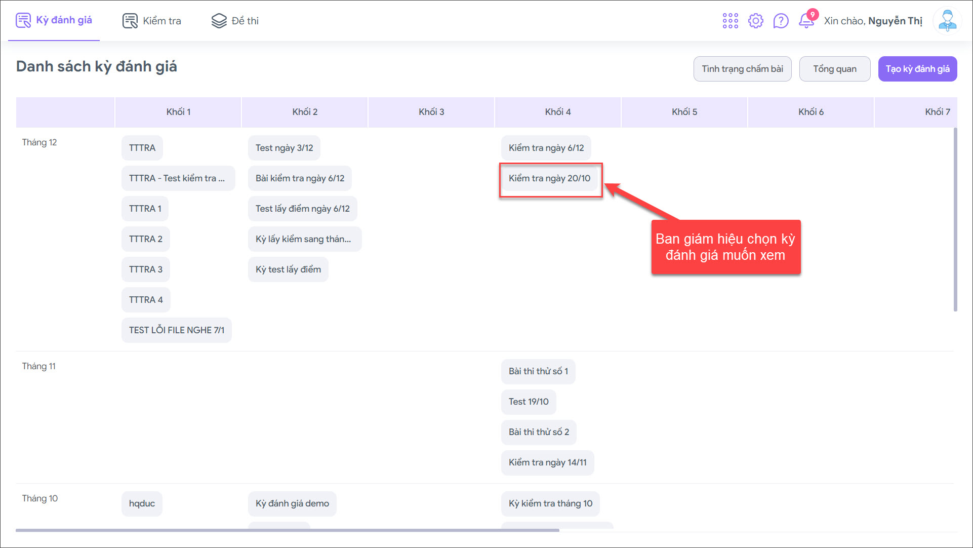 Bước 2: Ban Giám hiệu chọn kỳ đánh giá muốn xem.
