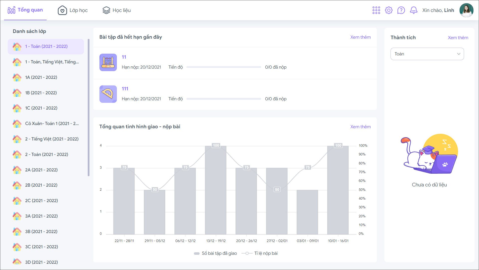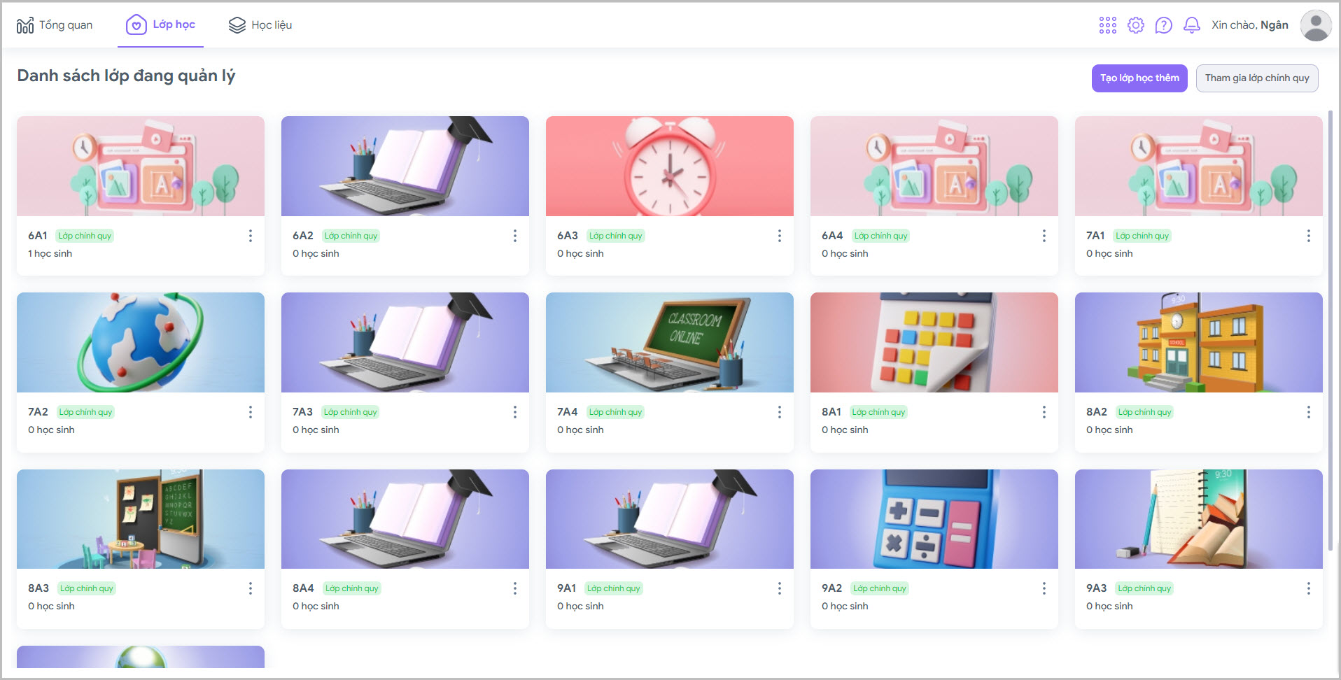 Bước 3: Sau khi nhấn Đăng nhập, màn hình sẽ hiện lên thông tin: Tổng quan, Lớp học, Học liệu..