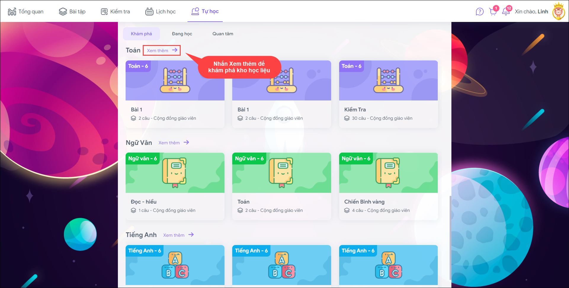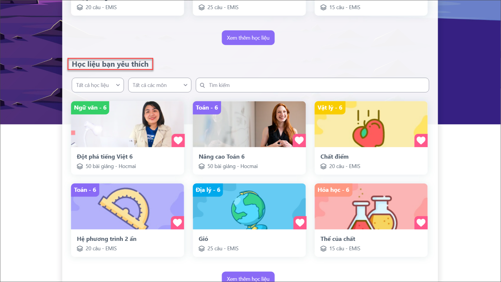 - Để xem nhiều học liệu hơn, Học sinh ấn Xem thêm ở từng danh sách.