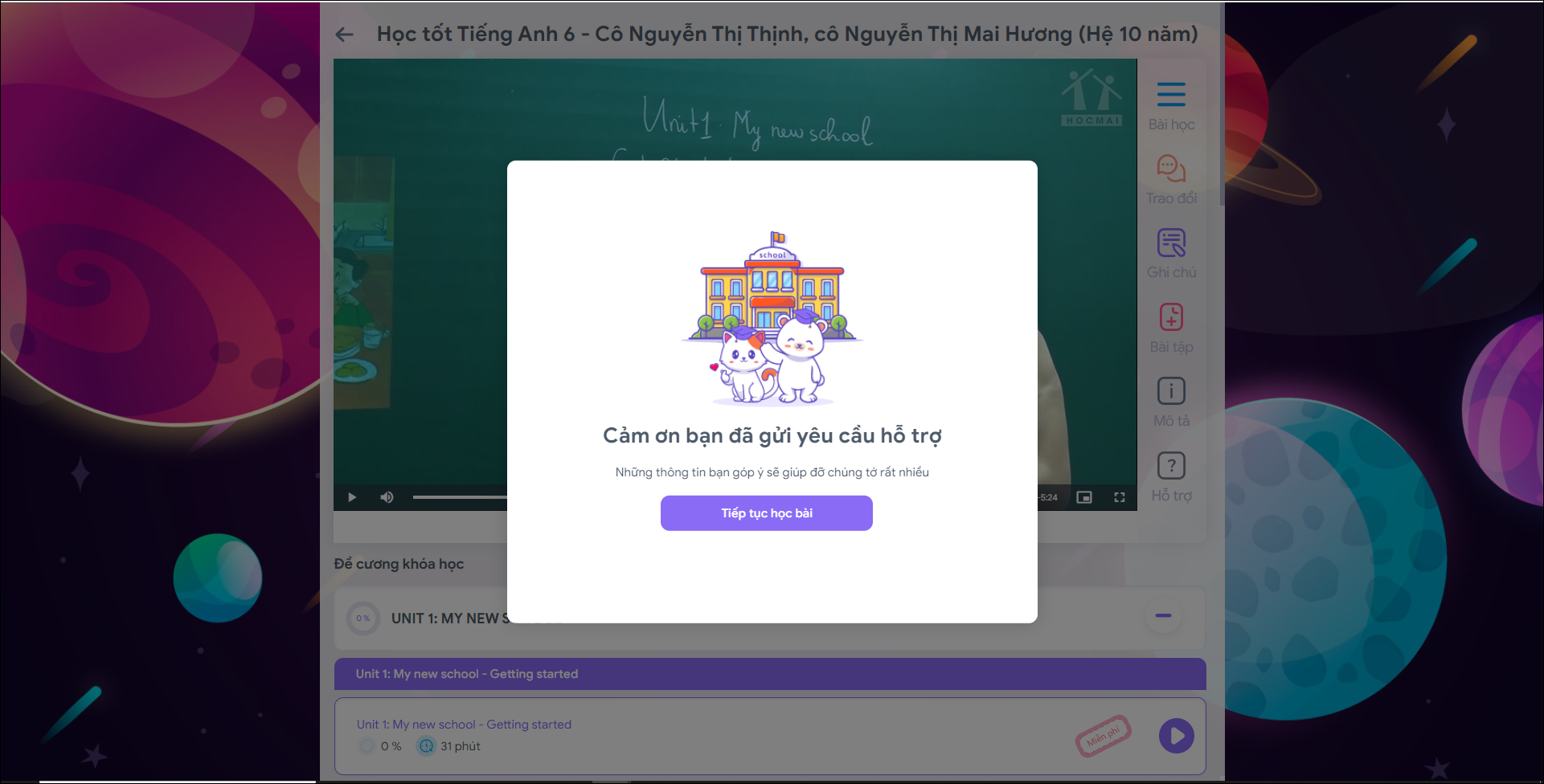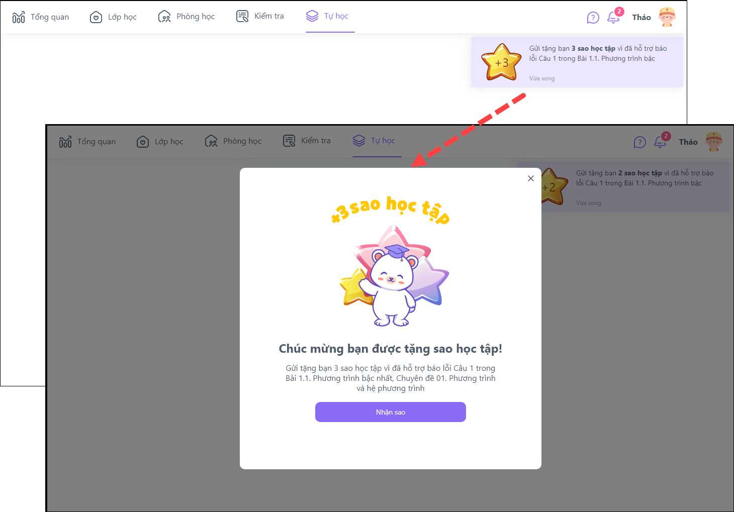- Sau khi hệ thống khắc phục lỗi học liệu xong, học sinh nhận được thông báo tặng 3 sao học tập vì đã báo lỗi học liệu.