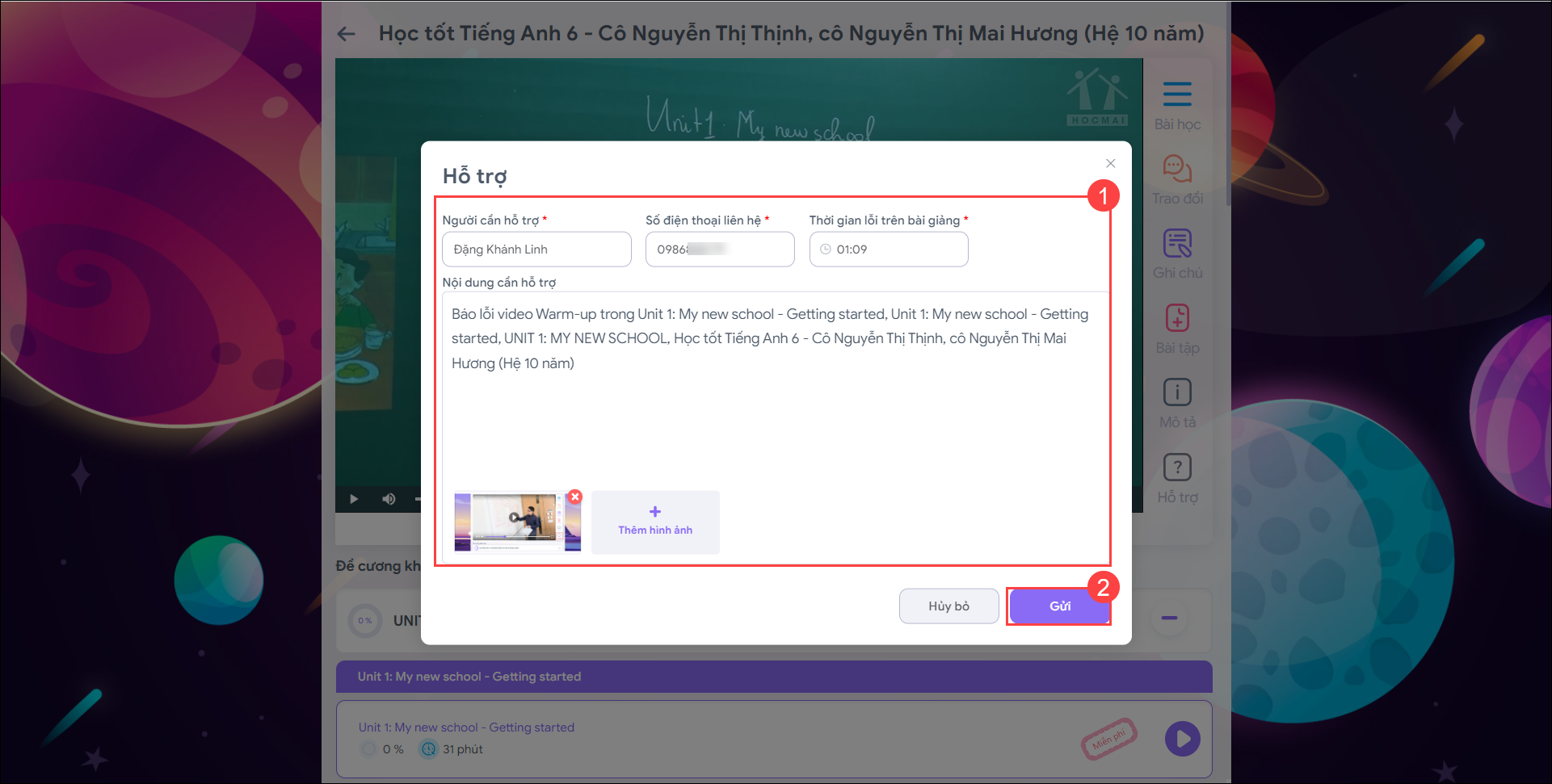 - Nội dung cần hỗ trợ: học sinh nhập nội dung cần báo lỗi.