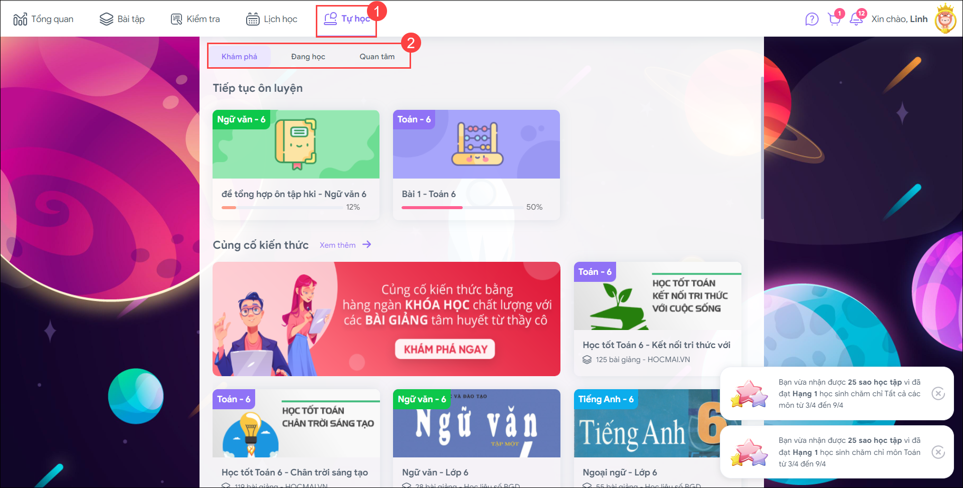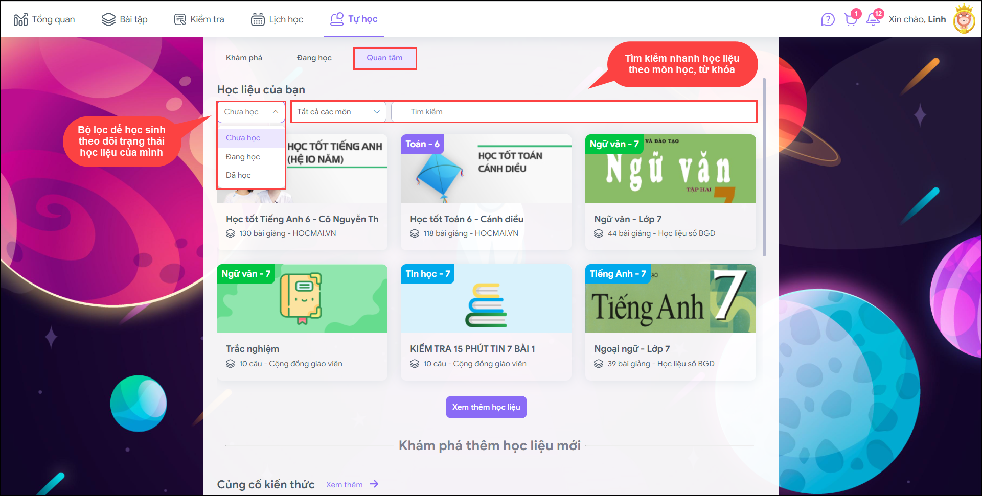 Học sinh vào Tự học, màn hình sẽ hiển thị danh sách học liệu học sinh có thể tham khảo, bao gồm: Khám phá, Đang học, Quan tâm.