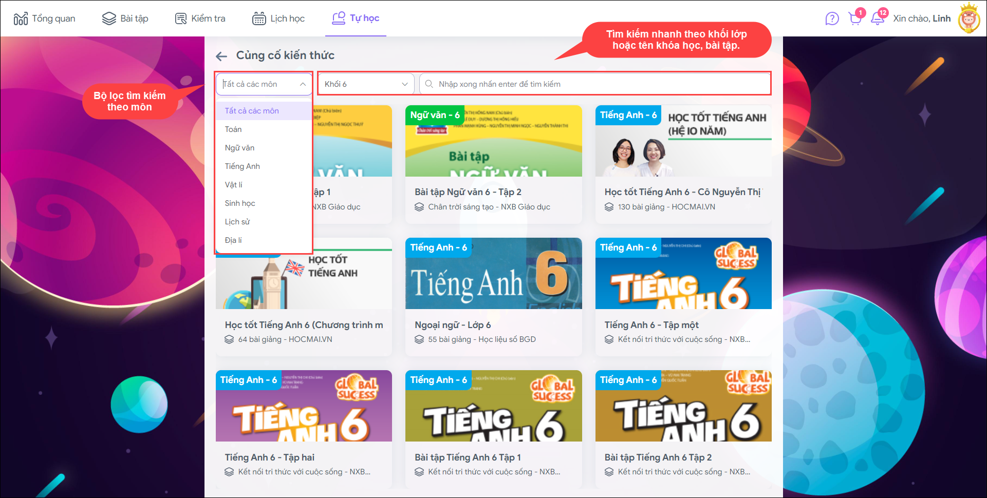 - Tại đây học sinh có thể lọc các học liệu theo tiêu chí : Môn học, khối lớp, hoặc gõ từ khóa để tìm kiếm.