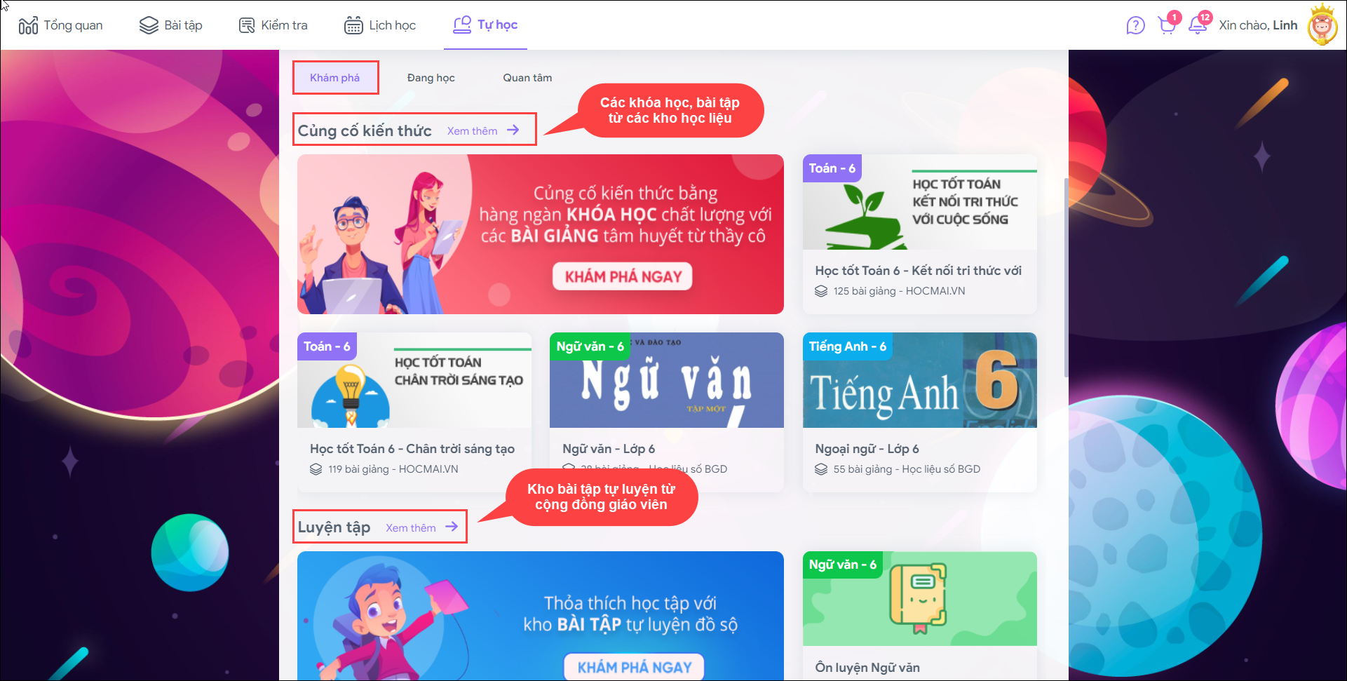 - Khám phá: Danh sách các học liệu, bài tập được sắp xếp theo nhu cầu tìm kiếm của học sinh
