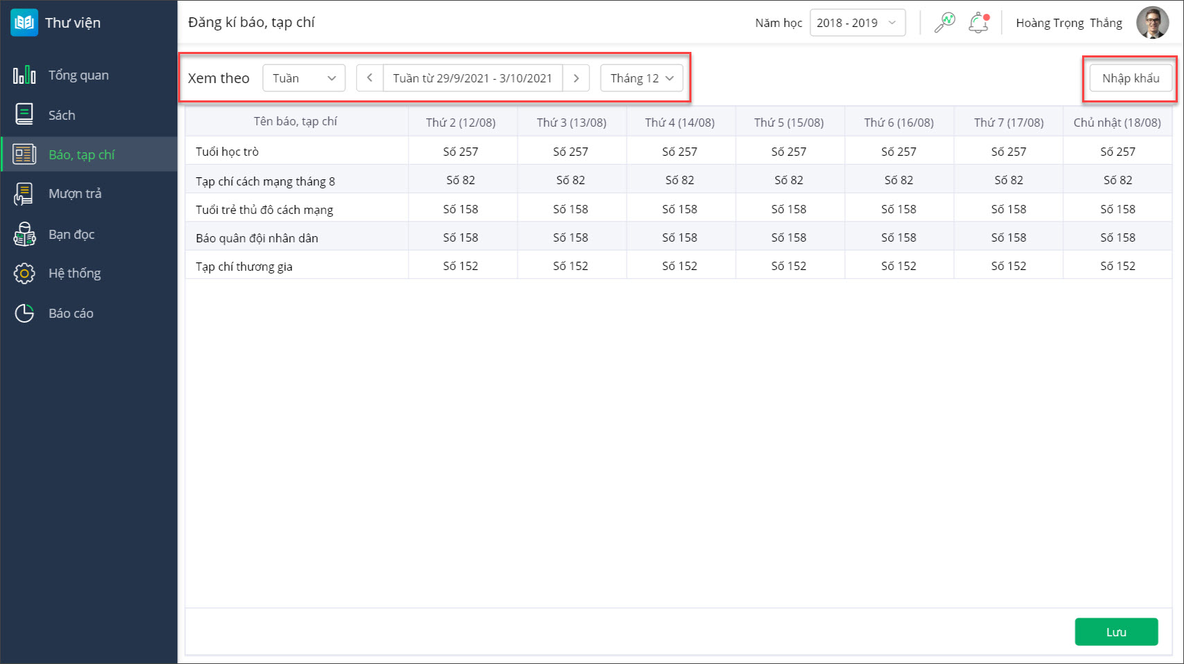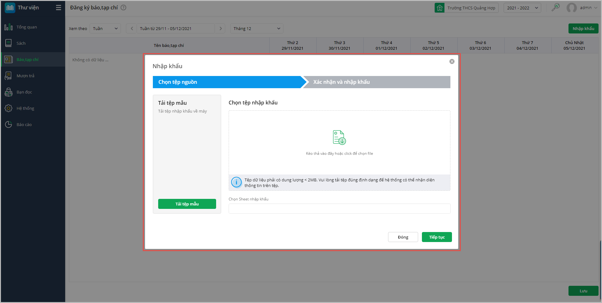 - Tại đây, anh chị chọn Nhập khẩu để nhập khẩu nhanh các thông tin báo tạp chí đăng ký để tiết kiệm thời gian nhập liệu.