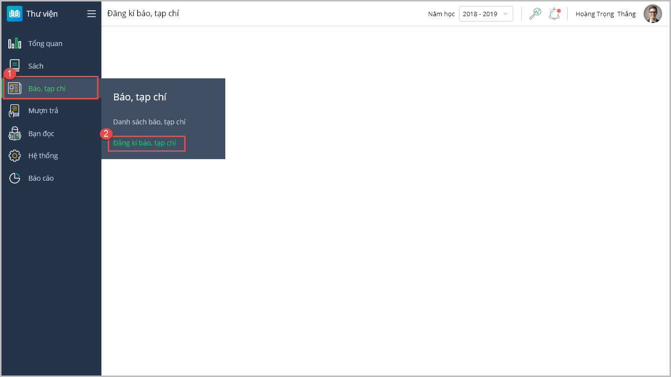 - Anh chị vào Thư viện/Báo, tạp chí/ Đăng ký báo, tạp chí.