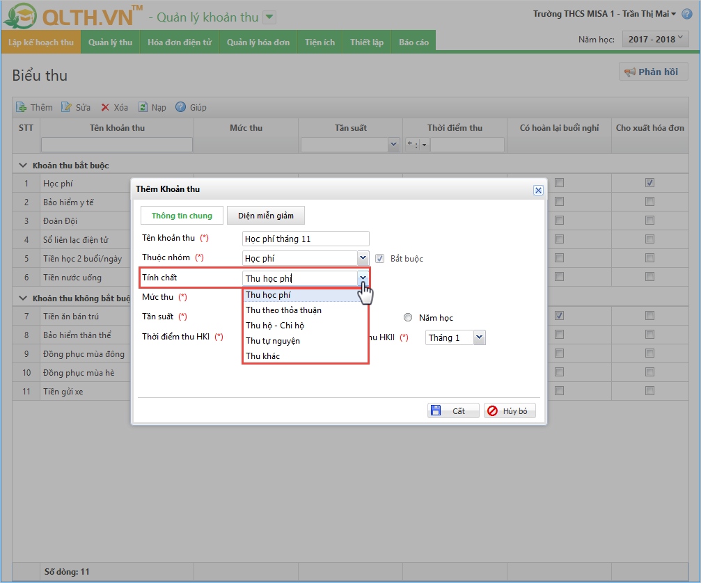 - Anh/chị có thể sửa lại tính chất hoặc thêm khoản thu nhu cầu quản lý riêng đơn vị thì chọn tính chất tương ứng để hạch toán chi tiết được trên Mimosa.