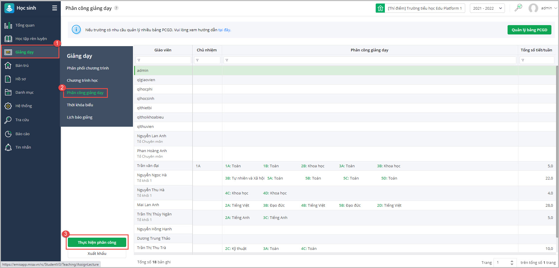 • Anh chị vào Giảng dạy/Phân công giảng dạy/Thực hiện phân công để tiến hành phân công giáo viên giảng dạy cho từng lớp, từng môn.