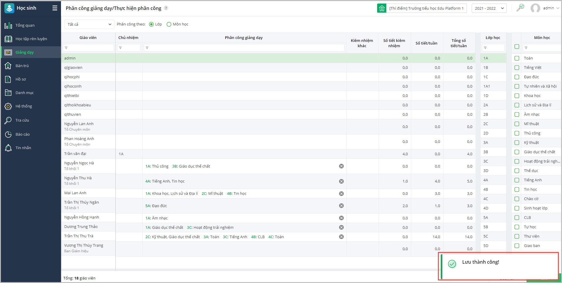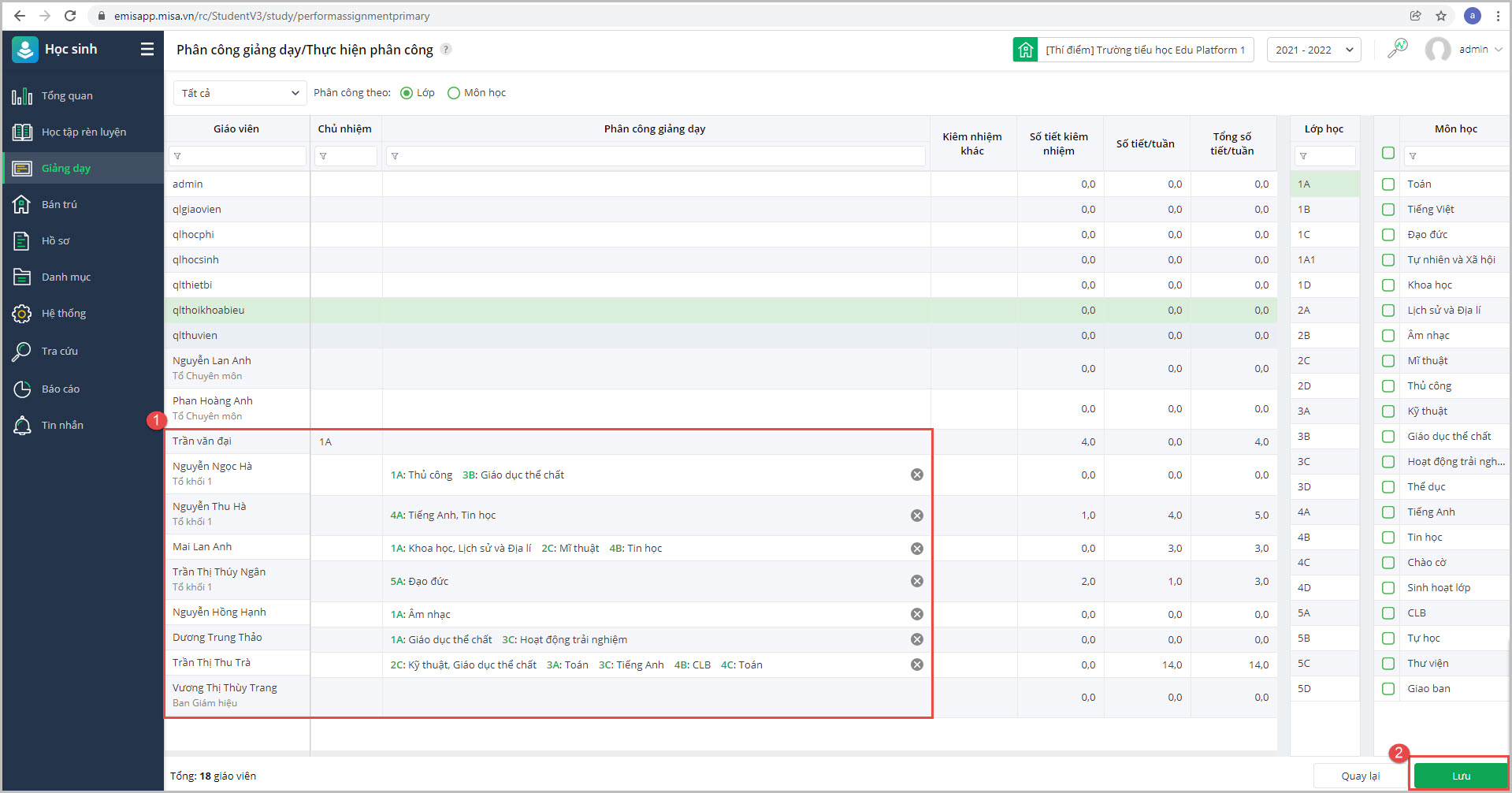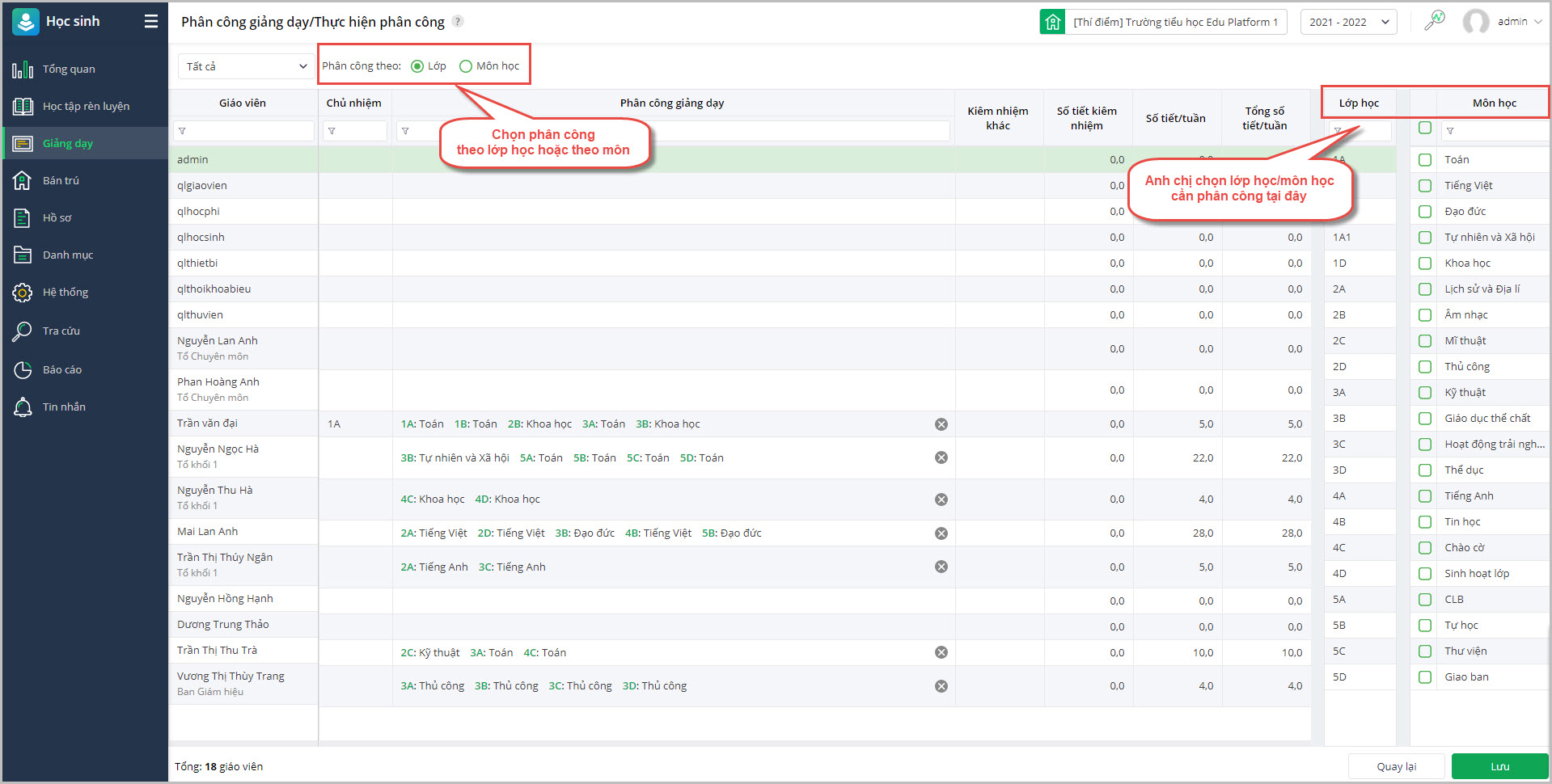 • Sau khi đã chọn được giáo viên, lớp học, môn học, anh chị ấn Lưu để phân công giáo viên giảng dạy.