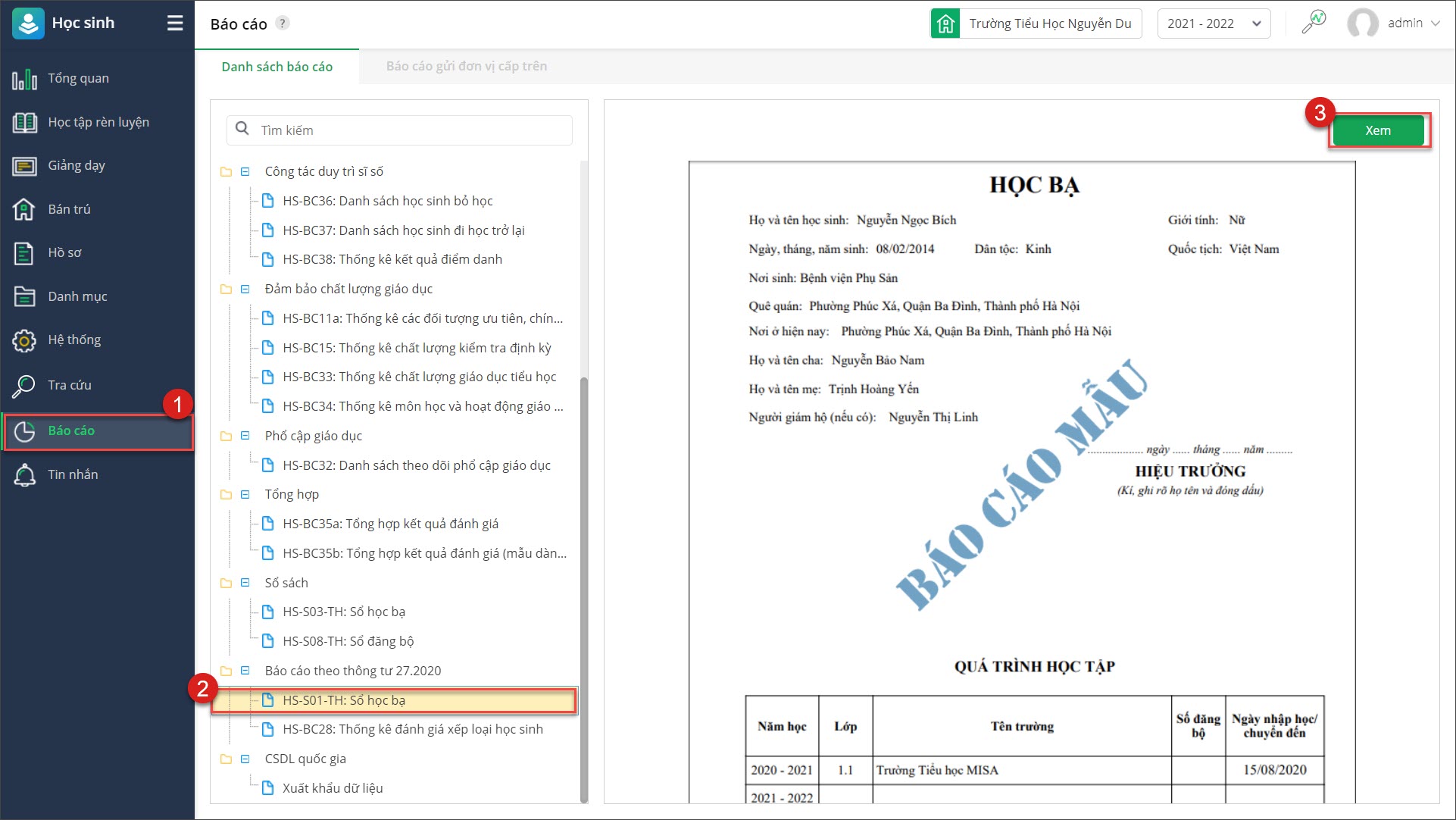 - Anh chị vào EMIS Học sinh/Báo cáo/Sổ học bạ/Xem để xem lại sổ học bạ và in số đăng bộ của học sinh trong sổ học bạ.