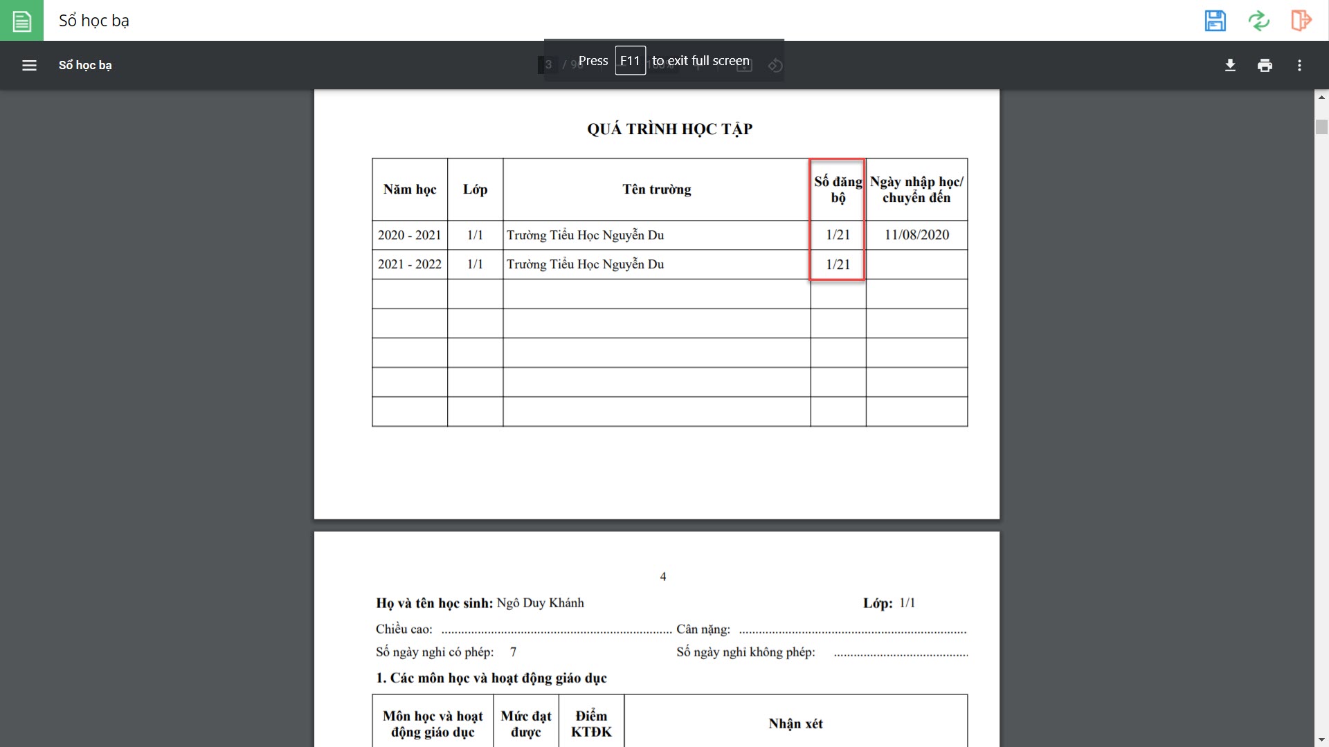 Từ phiên bản R126: Giáo vụ tiểu học có thể tự động lấy lên số đăng bộ của học sinh trong sổ học bạ để nắm bắt được thông tin.