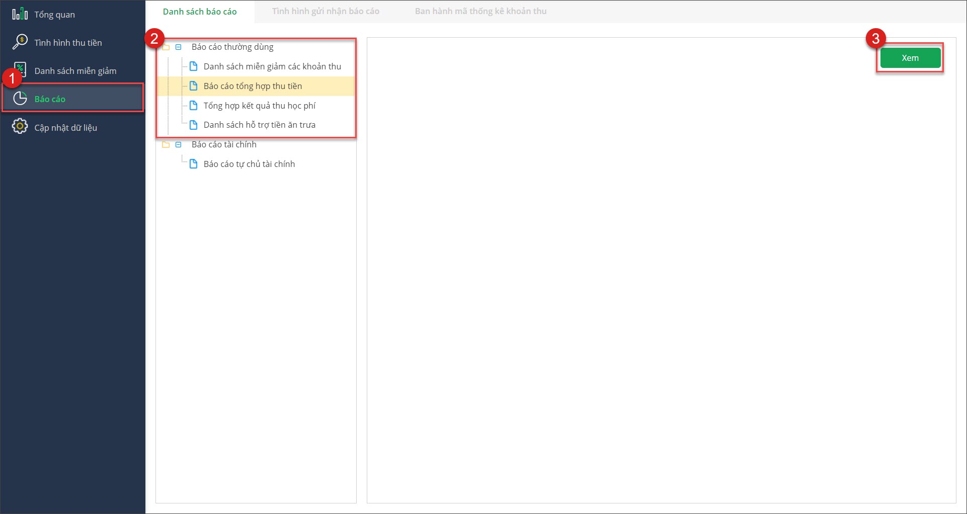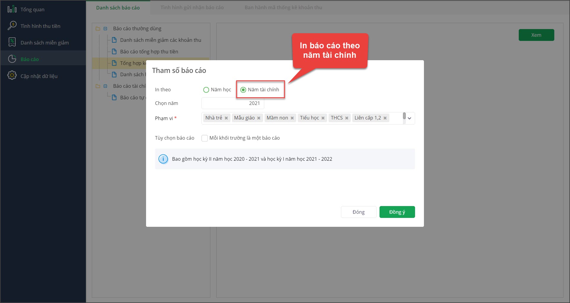 - Anh chị xem hướng dẫn chi tiết Báo cáo tổng hợp kết quả thu học phí tại đây.