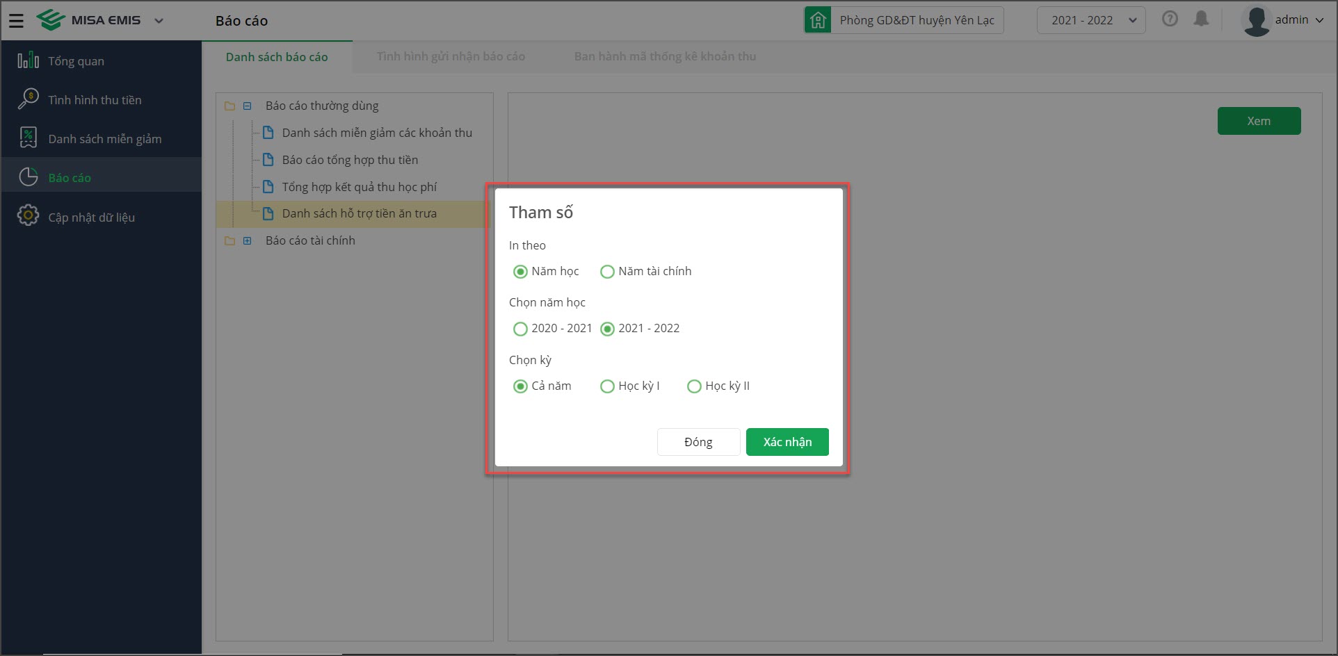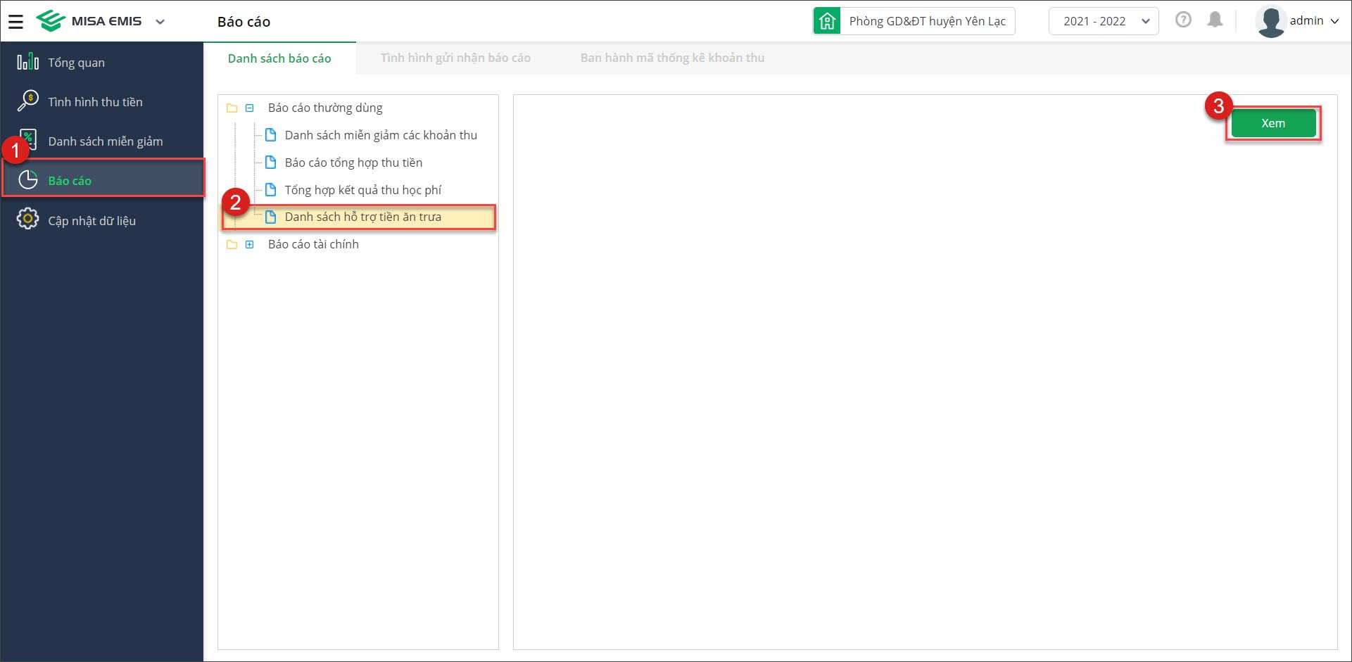 - Anh chị vào Báo cáo/Danh sách báo cáo chọn Danh sách hỗ trợ tiền ăn trưa, sau đó nhấn Xem để xem được danh sách học sinh được hỗ trợ tiền ăn trưa.