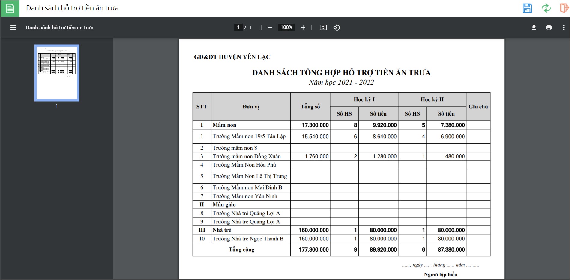 - Sau khi nhấn Xác nhận, anh chị dễ dàng theo dõi, in được danh sách hỗ trợ tiền ăn trưa theo đơn vị, học kỳ.