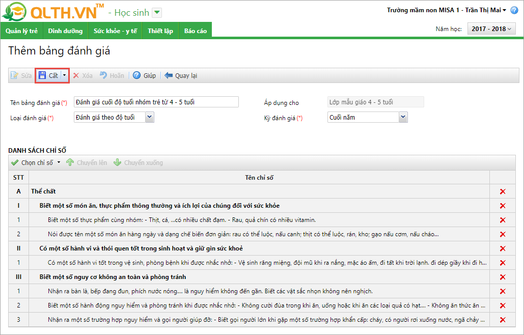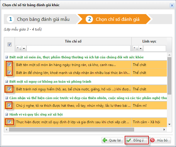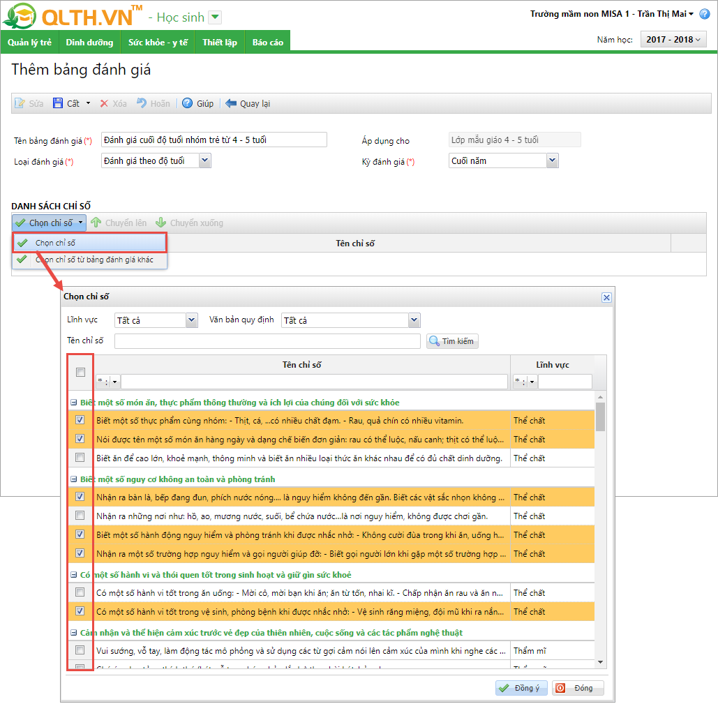 - Lựa chọn các chỉ số từ bảng đánh giá.