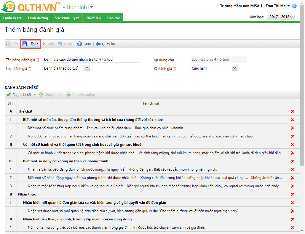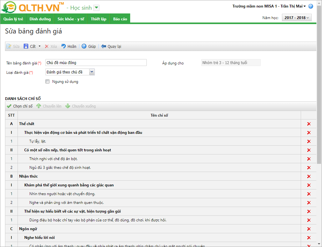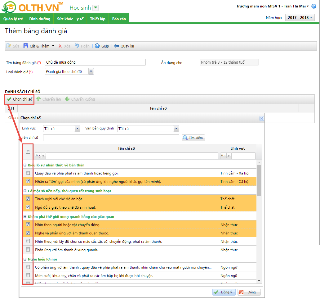 - Tích chọn chỉ số cần lập kế hoạch chi tiết theo từng Lĩnh vực: Nhận thức, Thói quen, Ngôn ngữ…