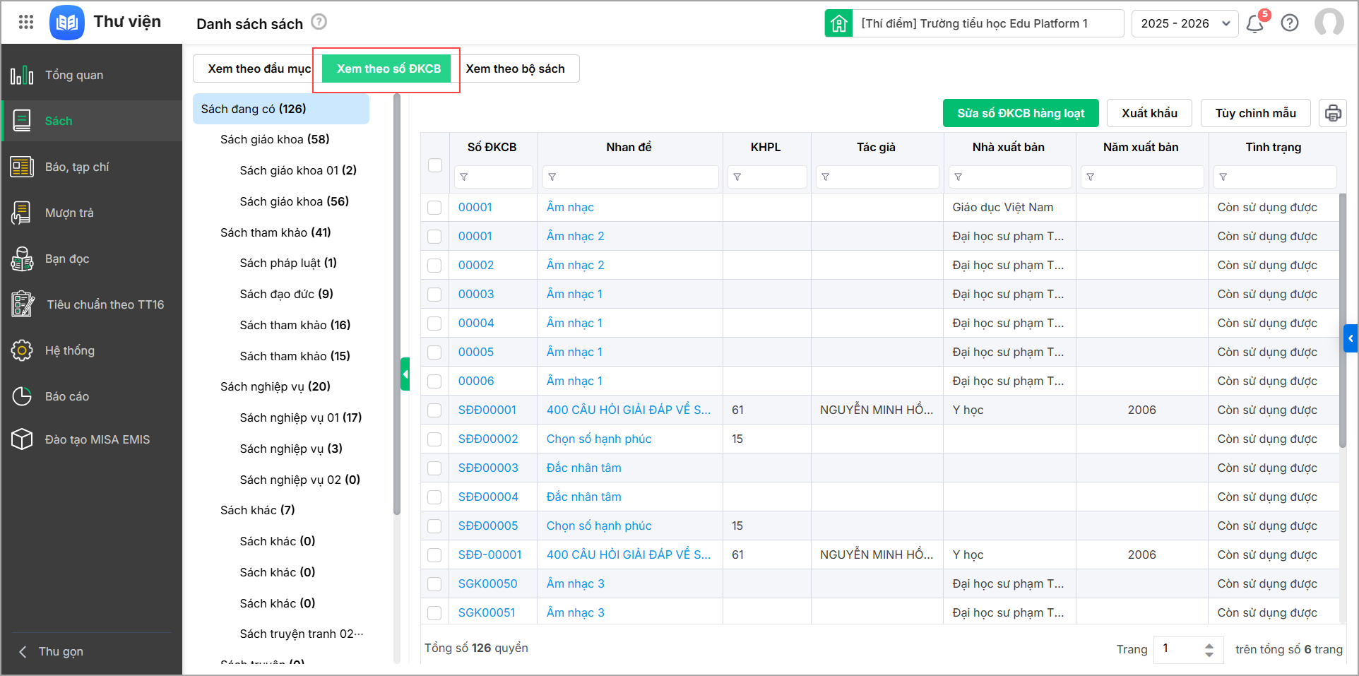 Bước 1: Anh chị đăng nhập vào MISA EMIS, chọn EMIS Thư viện/Sách/Danh sách sách.