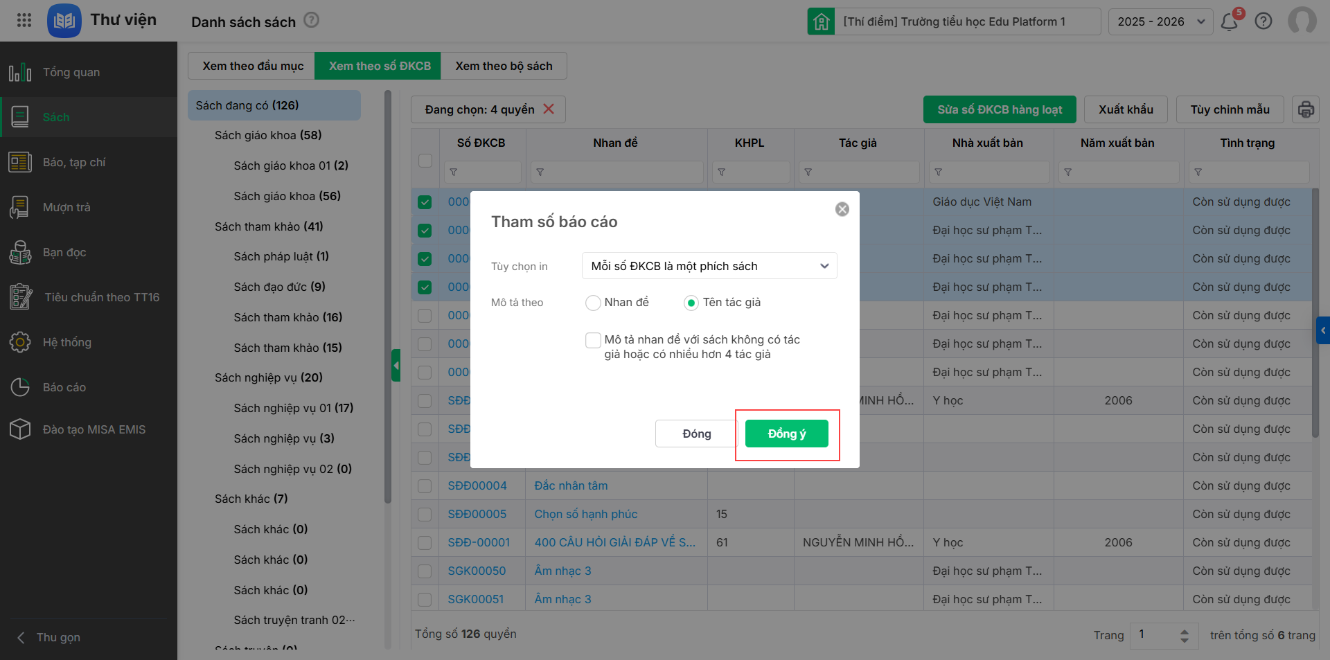 Bước 4: Anh/chị nhấn vào in theo Phích chuẩn ISBD, chọn các tham số muốn in và nhấn Đồng ý.