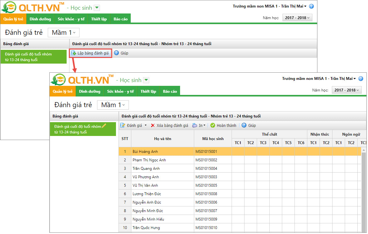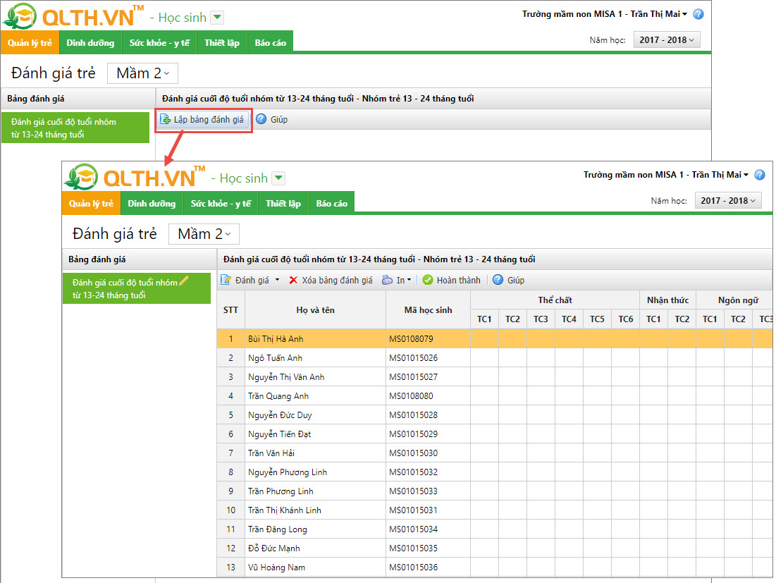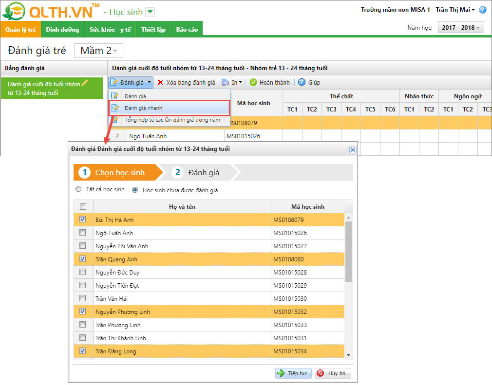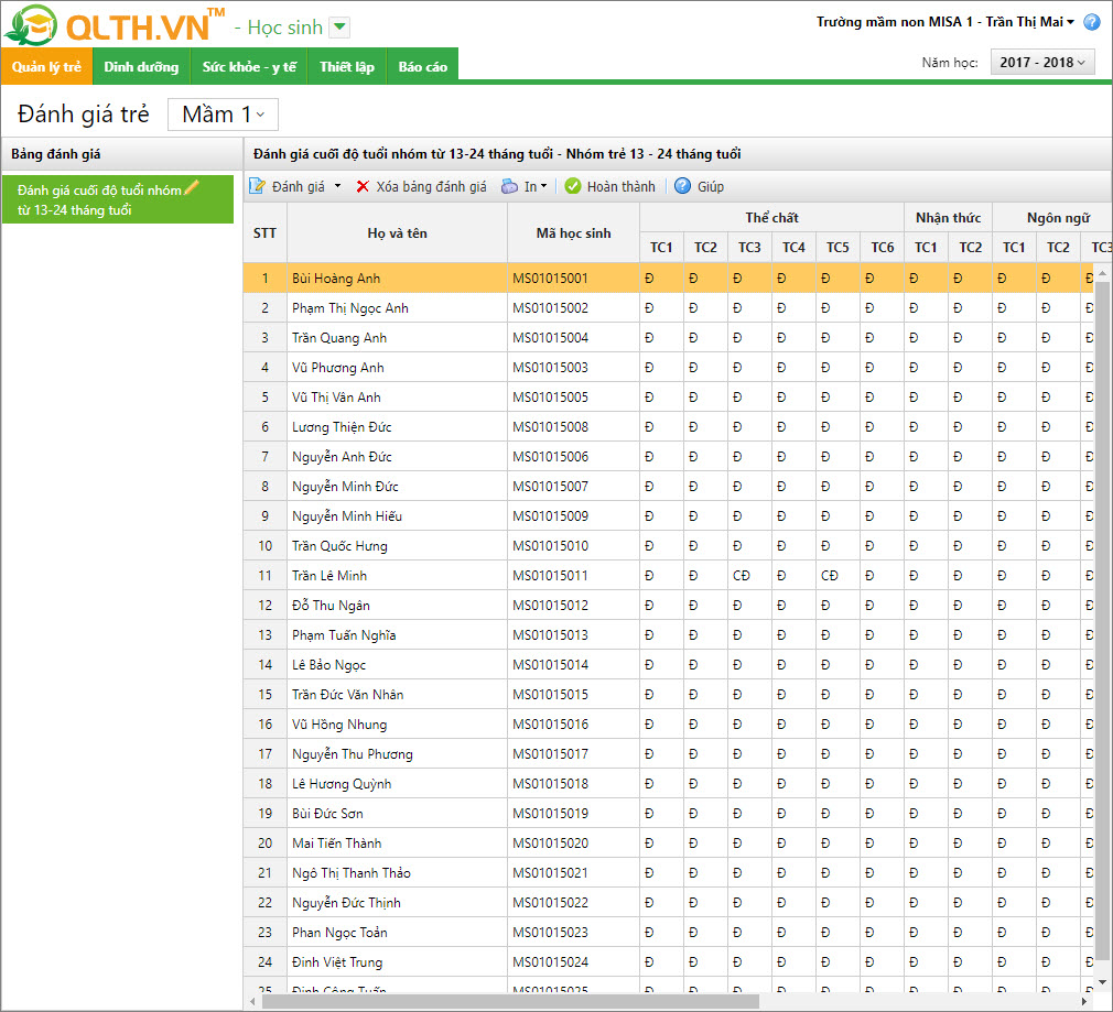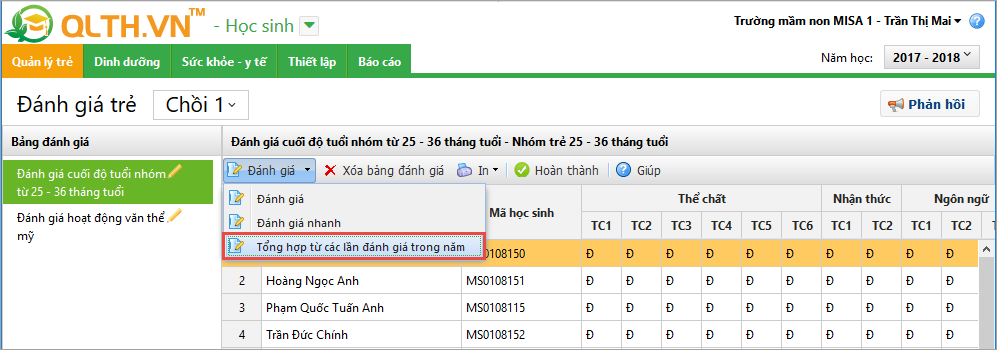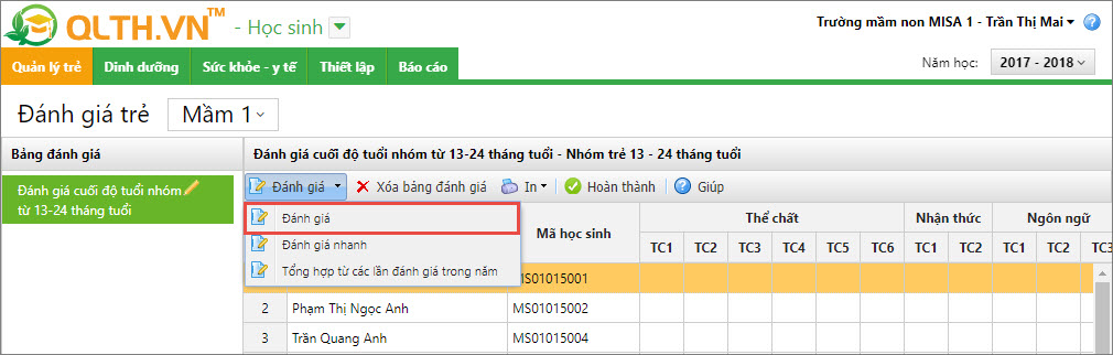 1. Vào Quản lý trẻ\Đánh giá trẻ.