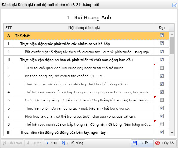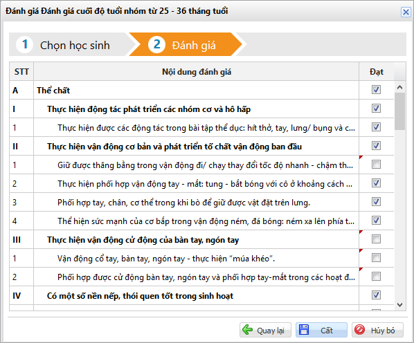 thống đã mặc định sẵn tất cả các chỉ số là Đạt (Trường hợp học sinh không đạt chỉ số nào, anh/chị thực hiện bỏ tích tại chỉ số tương ứng).- Nhấn Cất.