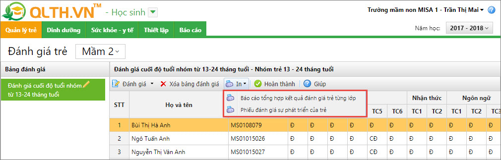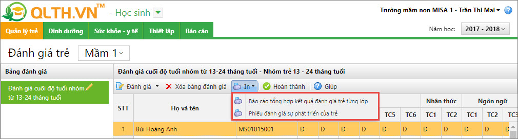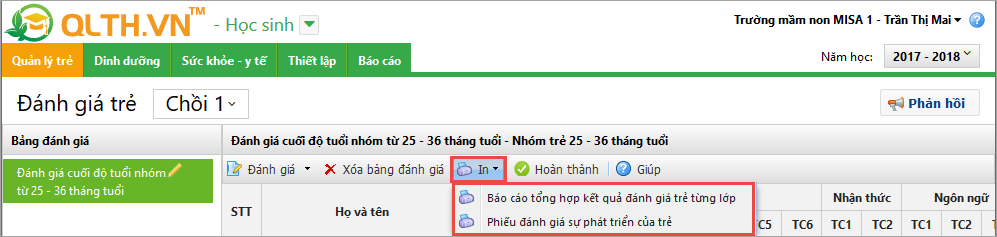 10. Xem/In được Tổng hợp kết quả đánh giá khối mẫu giáo bằng cách chọn chức năng In trên thanh công cụ.