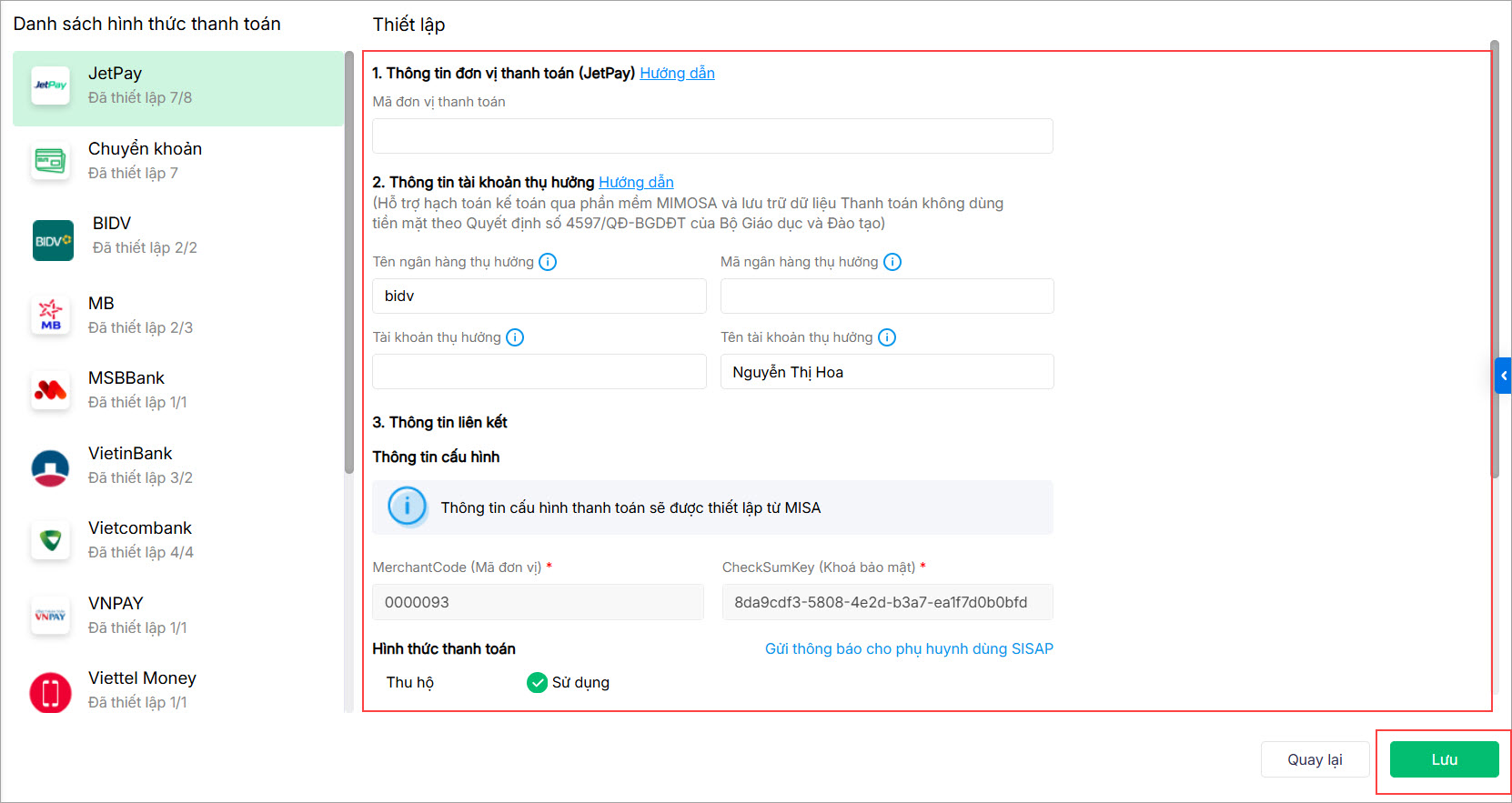 Mục đích: Nhà trường đăng ký thanh toán học phí không dùng tiền mặt qua JETPAY ngay trên phần mềm EMIS Khoản thu.