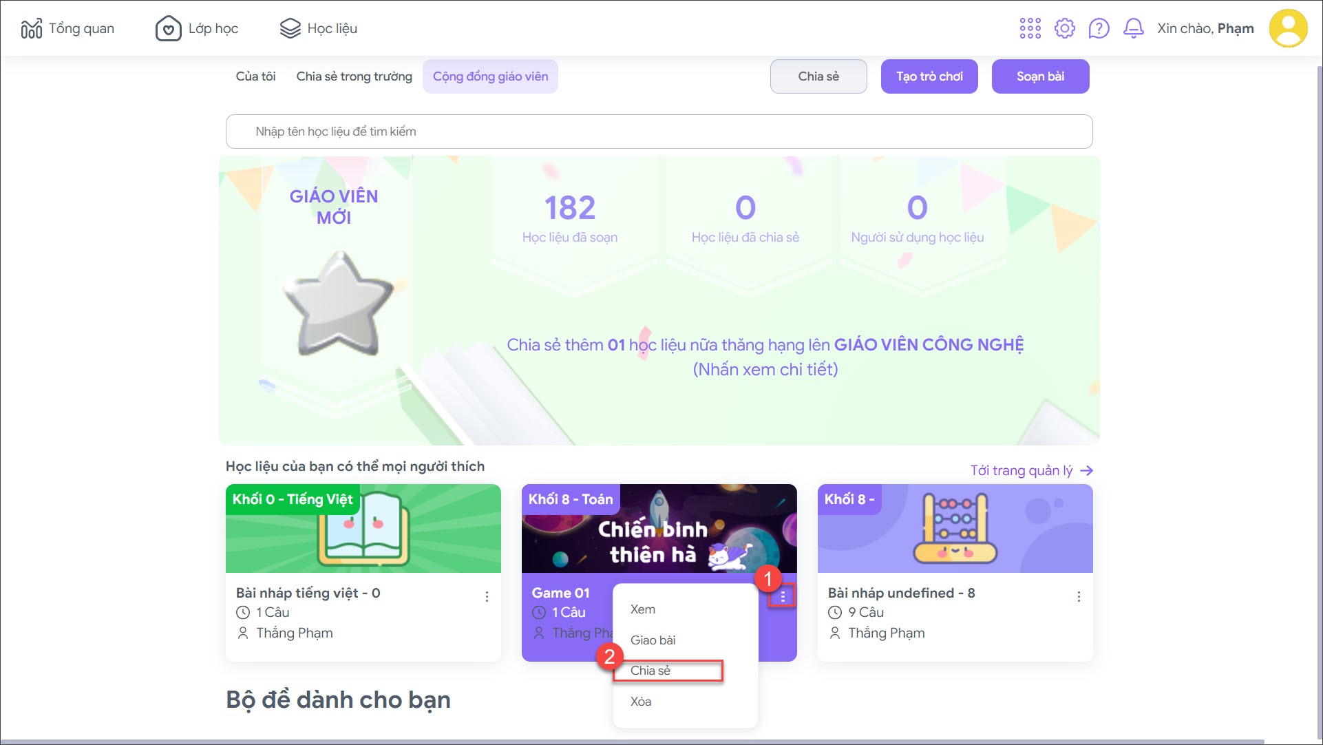 • Để chia sẻ học liệu với các giáo viên khác, giáo viên chọn vào học liệu muốn chia sẻ, chọn biểu tượng dấu 3 chấm.