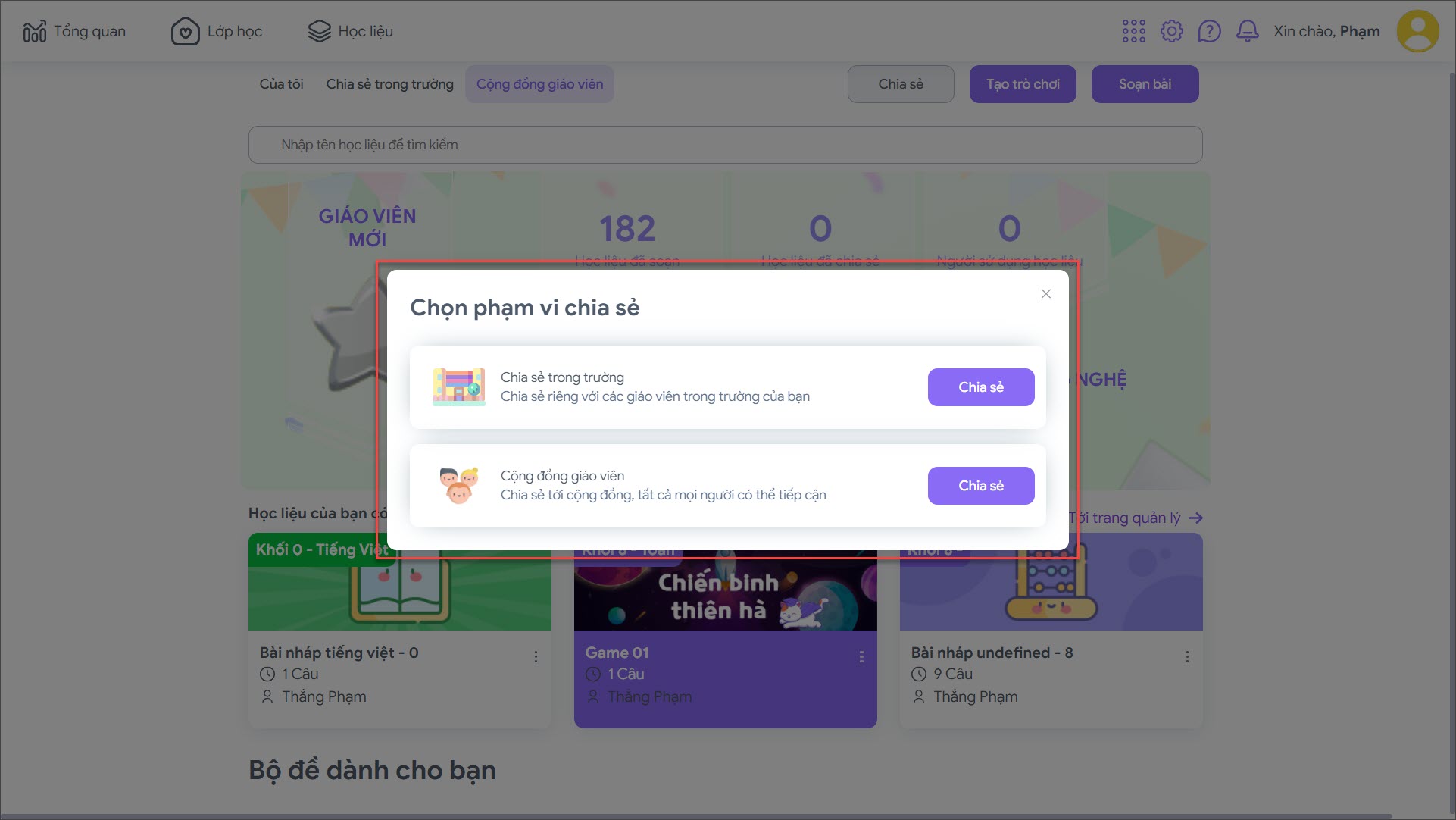 • Thầy cô chọn Chia sẻ, nếu muốn chia sẻ tới các thầy cô khác trong trường giáo viên chỉ cần chọn Chia sẻ trong trường. Nếu muốn chia sẻ tới cộng đồng các giáo viên khác thì chọn Cộng đồng giáo viên.