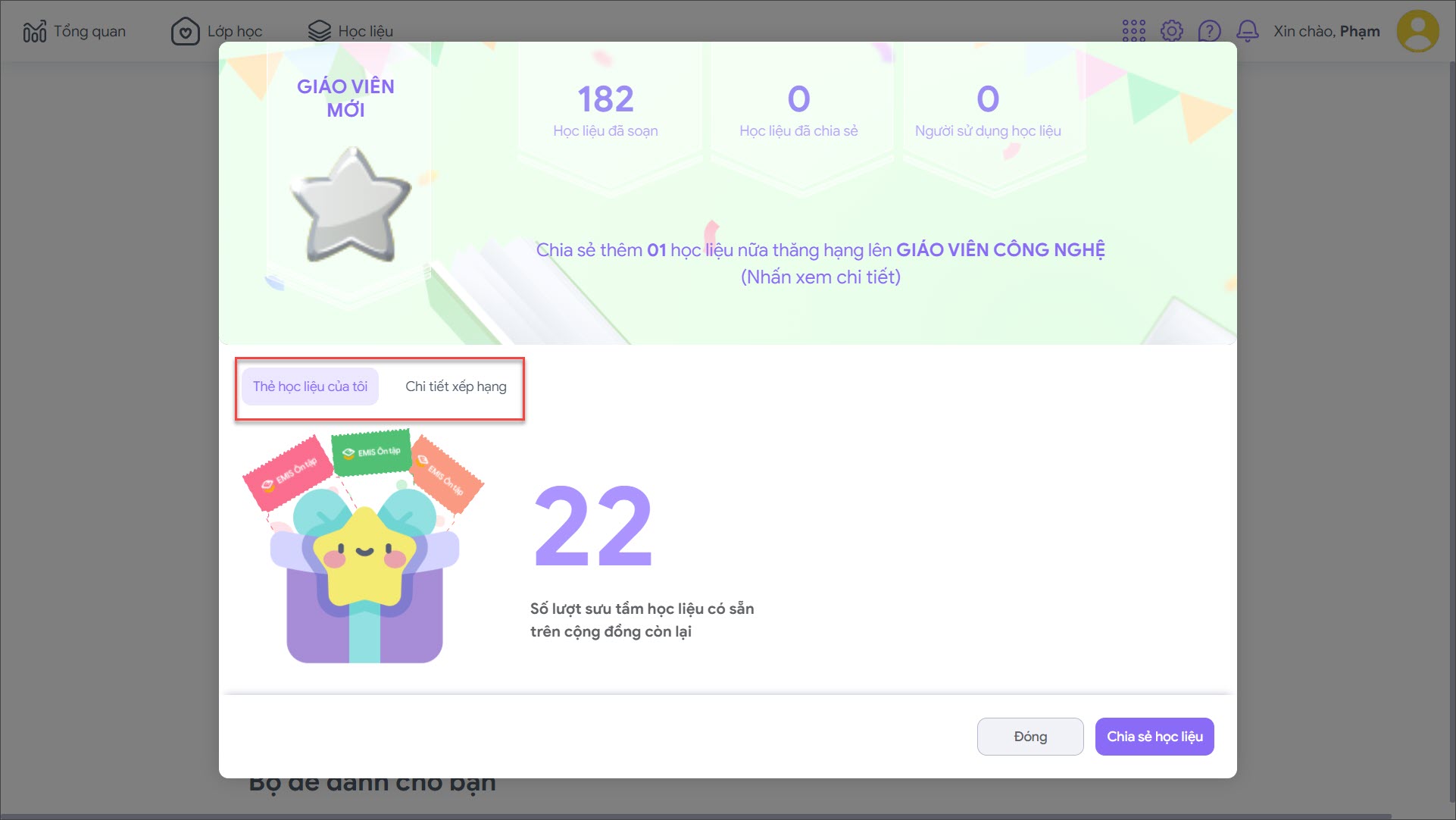 • Giáo viên xem các thẻ học liệu và chi tiết xếp hạng của mình đơn giản, nhanh chóng.