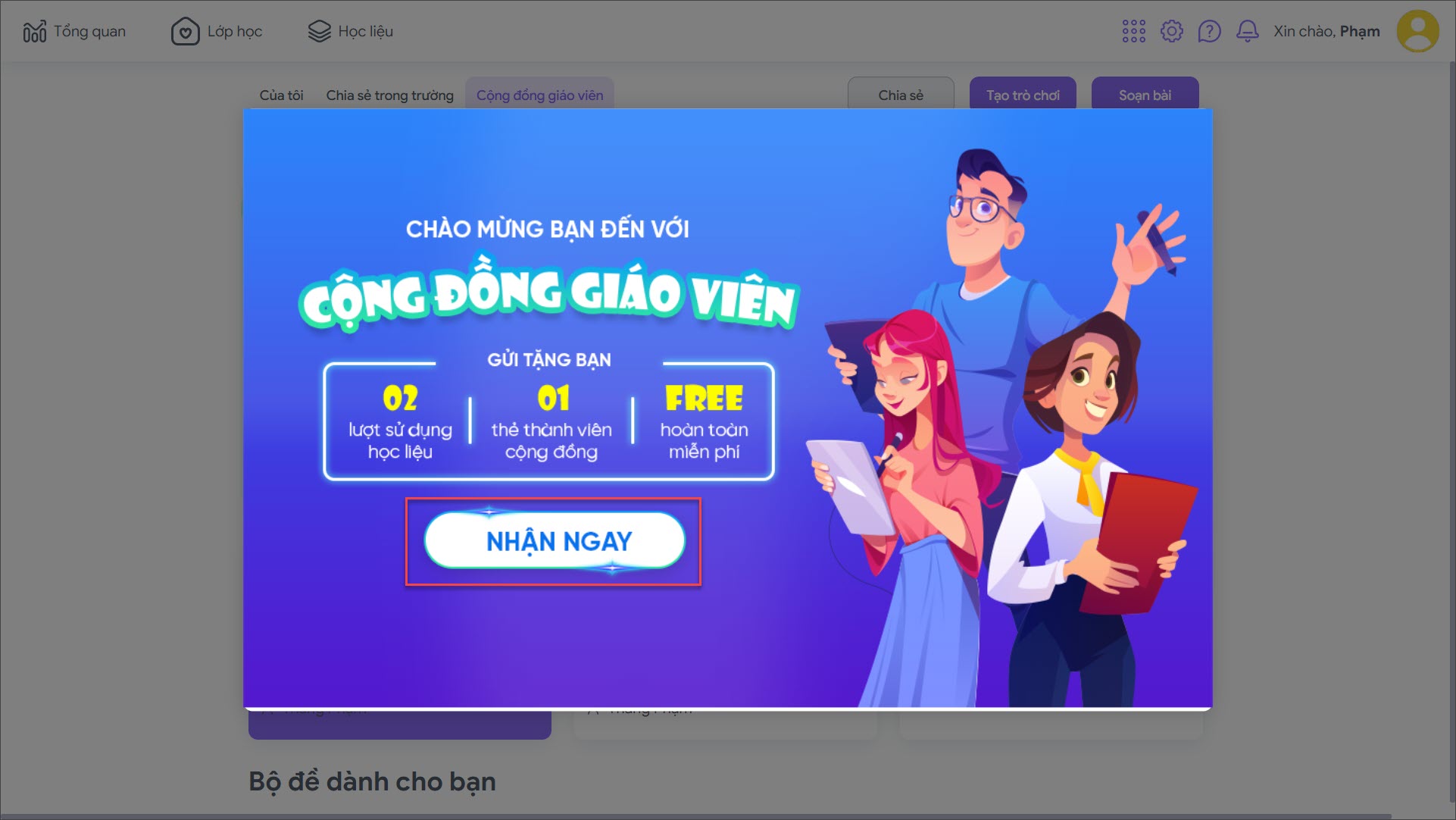 • Thầy cô sau khi đăng nhập EMIS Ôn tập, thầy cô chọn Học liệu, màn hình hiện lên thông báo với giáo viên. Thầy cô nhận được nhận được 2 lượt sử dụng học liệu, thẻ thành viên của cộng đồng, thầy cô nhấn Nhận ngay để bắt đầu sử dụng.