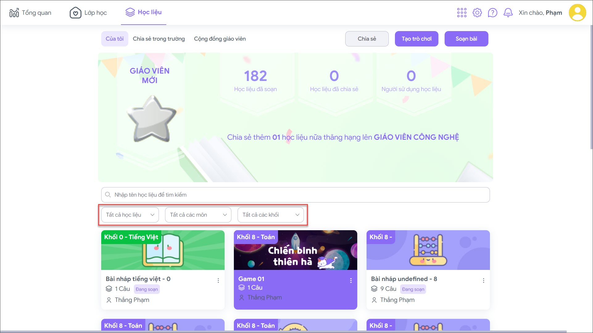 Giúp giáo viên tối ưu việc quản lý các danh sách học liệu đã soạn và các học liệu đang chia sẻ.