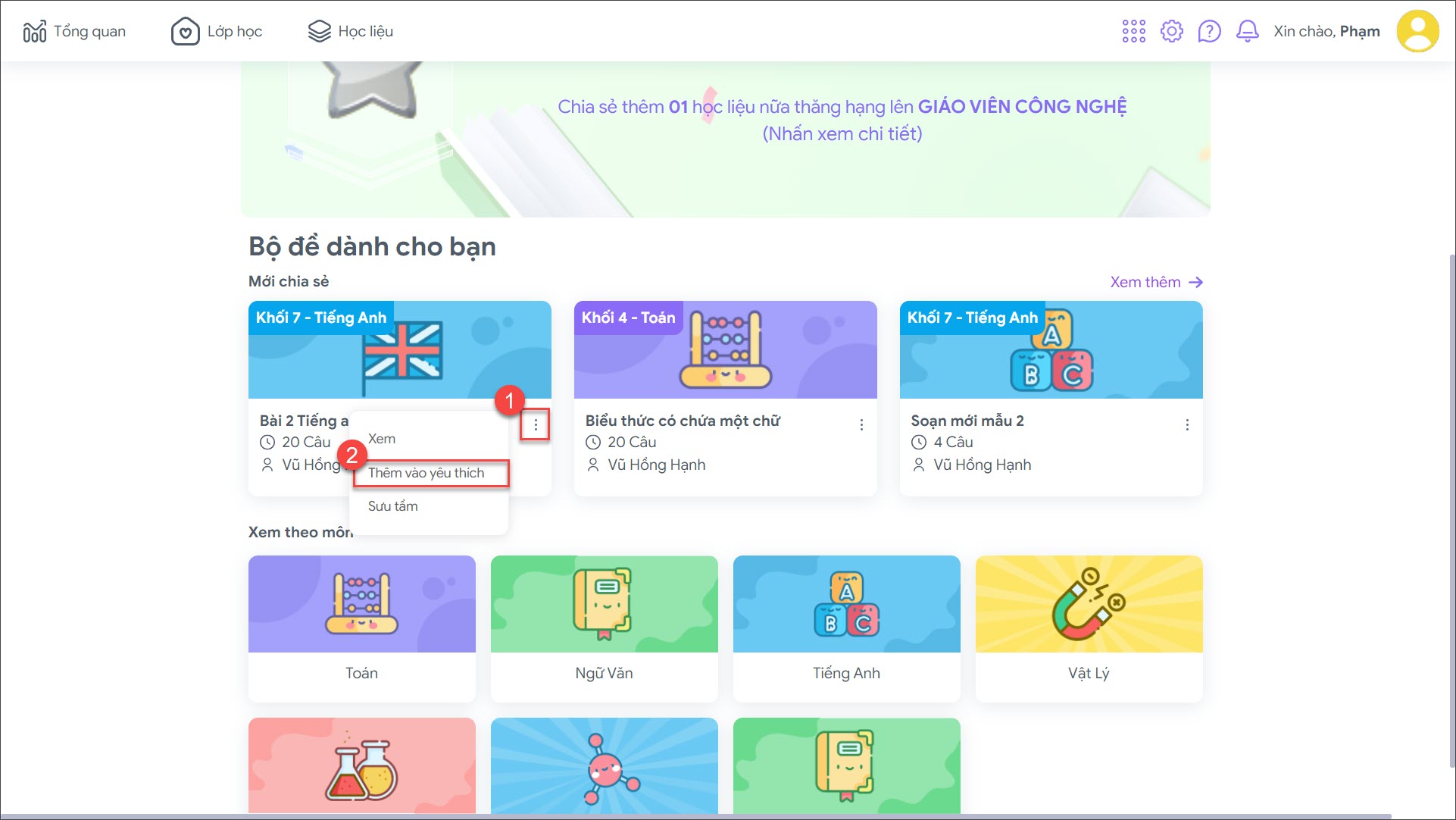 • Nếu muốn thêm học liệu vào danh sách yêu thích để soạn bài hoặc giao bài nhanh cho học sinh, giáo viên chọn Chia sẻ trong trường/ nhấn vào biểu tượng dấu 3 chấm/Thêm vào yêu thích.