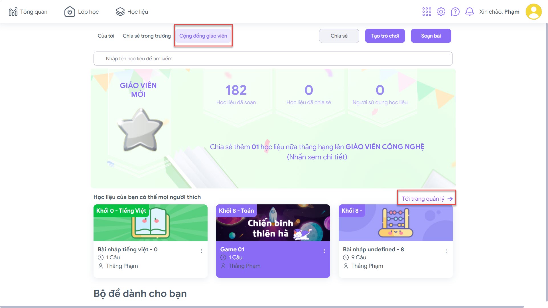 • Giáo viên muốn xem thêm các học liệu chỉ cần chọn Tới trang quản lý.