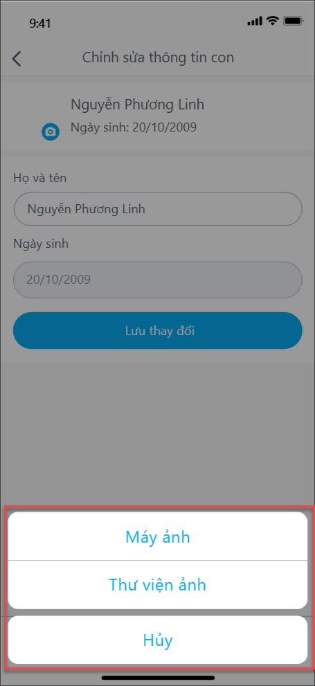 - Phụ huynh chọn tải ảnh từ Máy ảnh hoặc Thư viện ảnh.