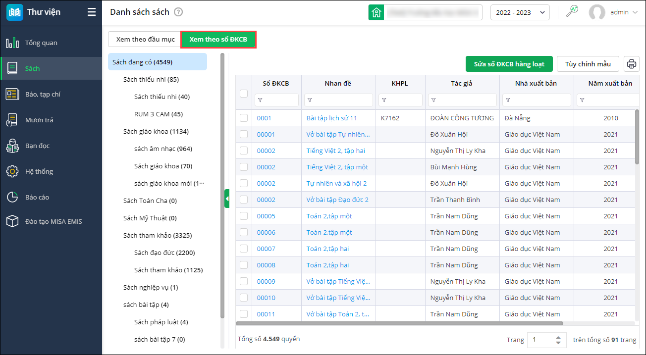 Anh/chị có thể xem toàn bộ số sách trên phần mềm, bao gồm chuyển từ V1 sang V2 bằng cách vào Sách\Danh sách sách. Tại đây tích vào mục Xem theo số ĐKCB.