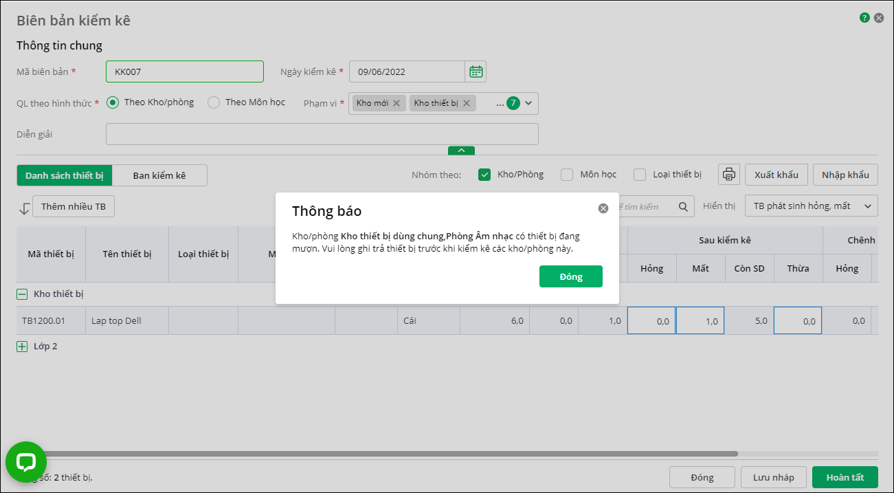 Khi bắt đầu thực hiện kiểm kê, anh/chị cần Thêm biên bản tại mục Thiết bị\Kiểm kê. Tuy nhiên, màn hình hiển thị thông báo kho/phòng có thiết bị đang mượn và cần ghi trả trước:
