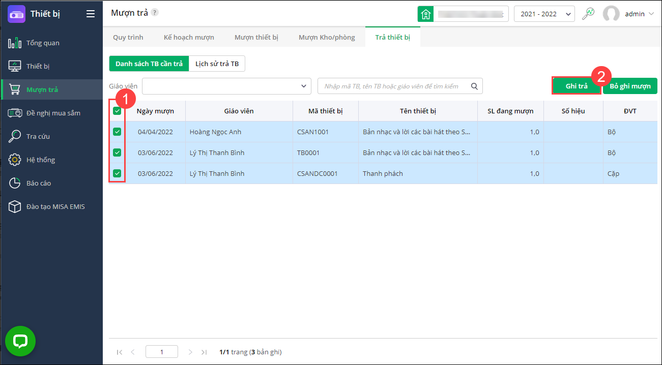 - Tại mục Danh sách TB cần trả, tích chọn các phiếu mượn thiết bị. Nhấn Ghi trả.