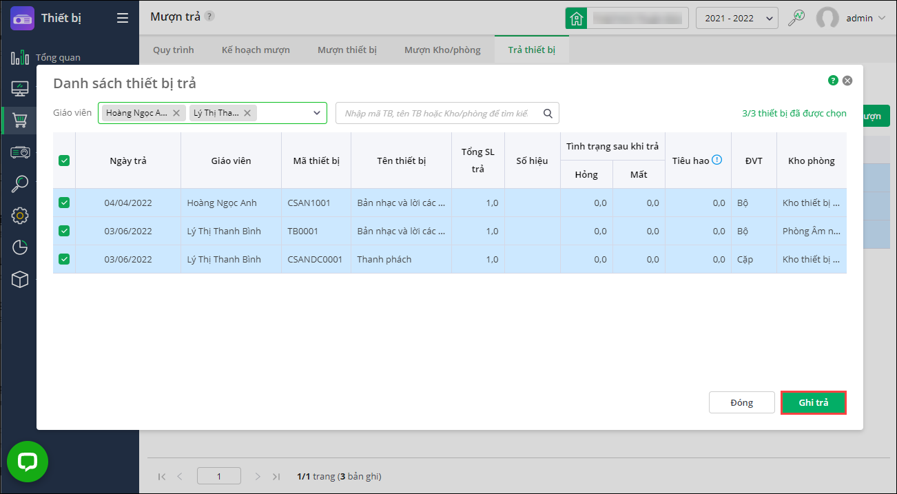 - Kiểm tra lại thông tin chi tiết trong danh sách thiết bị trả. Xác nhận Ghi trả.
