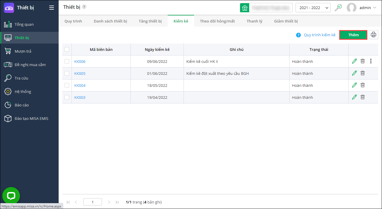 - Sau đó, anh/chị quay lại mục Thiết bị/Kiểm kê và tiến hành Thêm biên bản kiểm kê và tiến hành kiểm kê theo hướng dẫn chi tiết tại đây.
