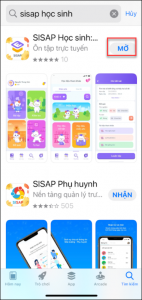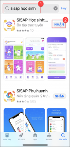 Bước 1: Vào Appstore, trên thanh công cụ tìm kiếm “SISAP Học sinh”. Chọn ứng dụng “SISAP Học sinh: Ôn tập” rồi nhấn “Nhận” để tải về ứng dụng.