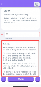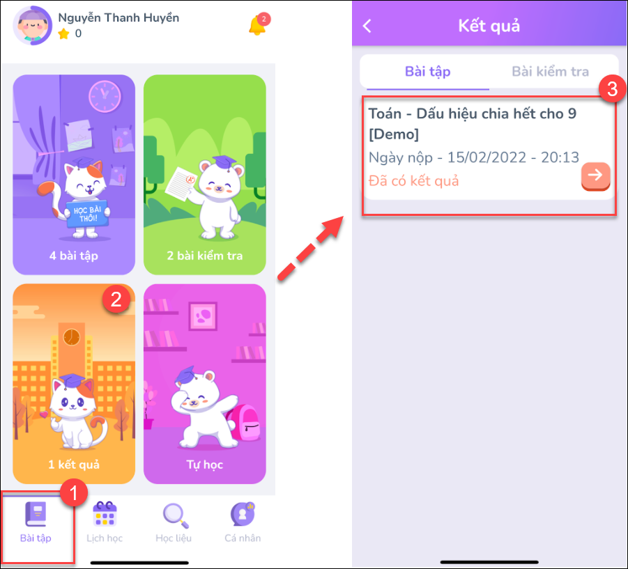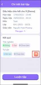 Bước 2: Màn hình hiển thị kết quả bài tập tương ứng số câu đúng/sai. Nhấn biểu tượng mũi tên để xem chi tiết kết quả từng câu.