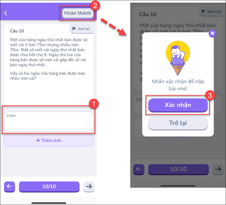 Bước 3: Lần lượt hoàn thành các câu trả lời rồi nhấn “Hoàn thành” và “Xác nhận” để nộp bài.